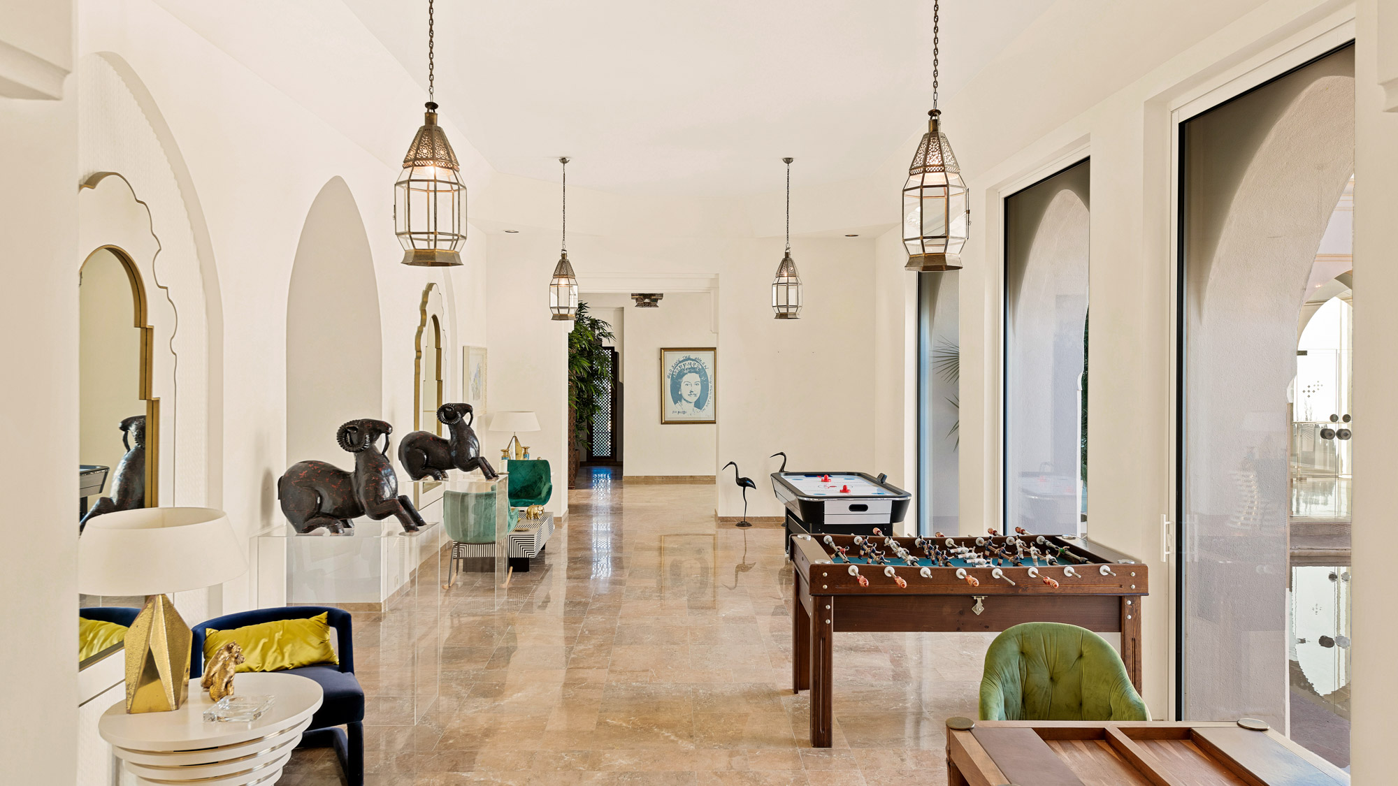 Villa Sirenique’s main house features a split-level ground floor living room ranged with bespoke designer pieces such as sumptuous velvet couches, a handsome gold-flecked coffee table and an impressive, vaulted ceiling with a unique, isometric design. Three Moroccan-arched floor-to-ceiling windows on the far wall display views of the gardens, palm trees and sea.