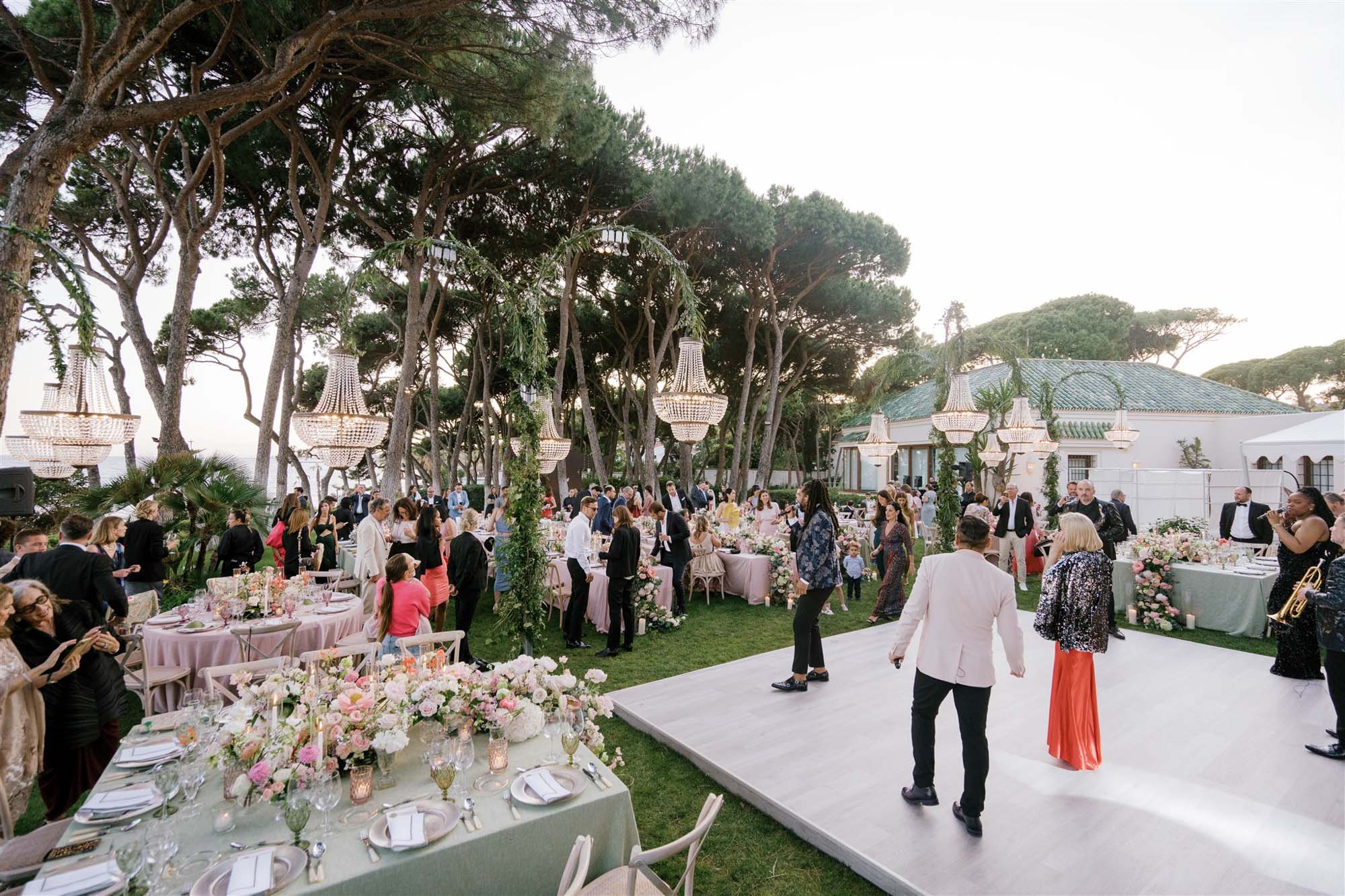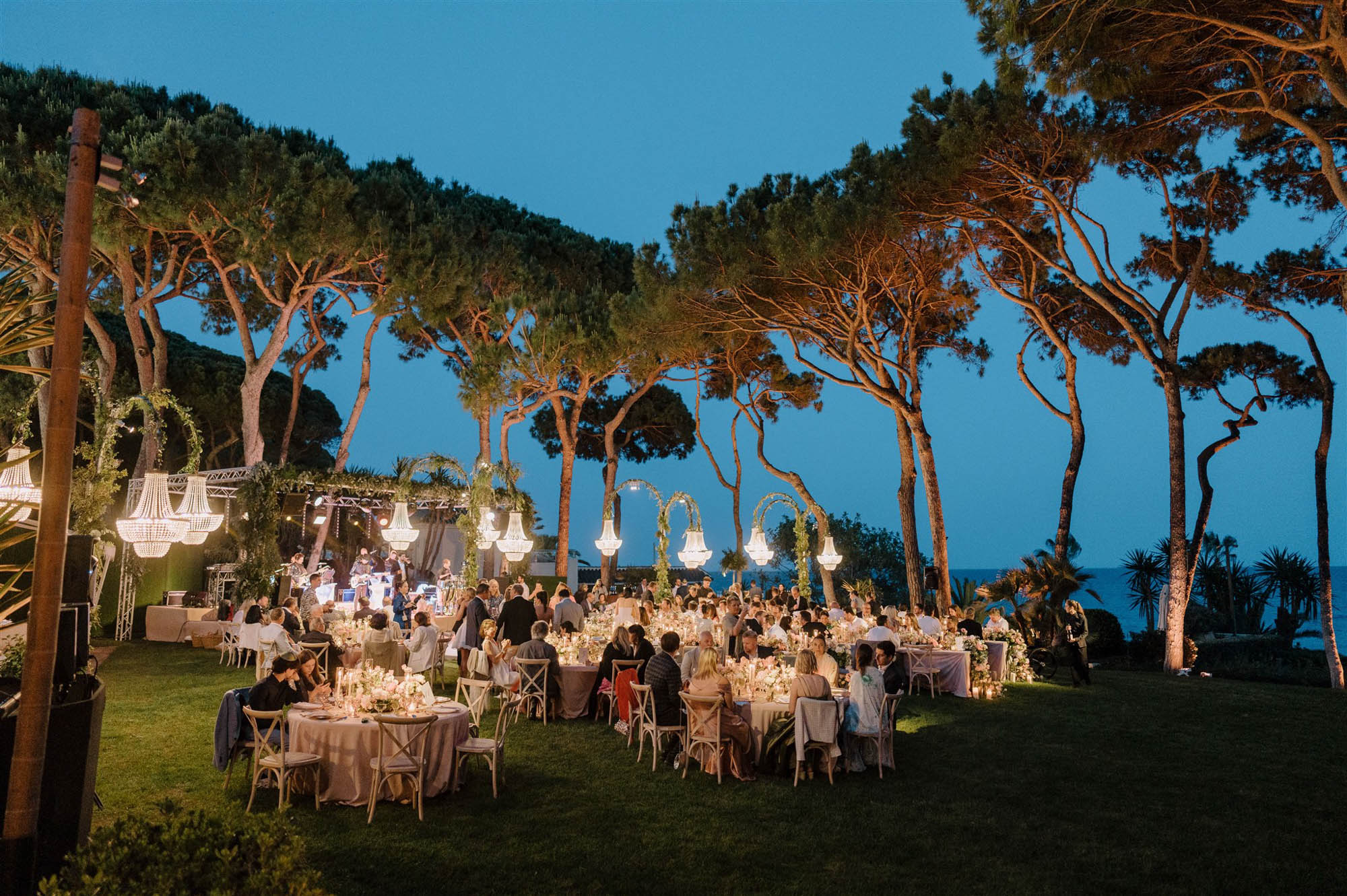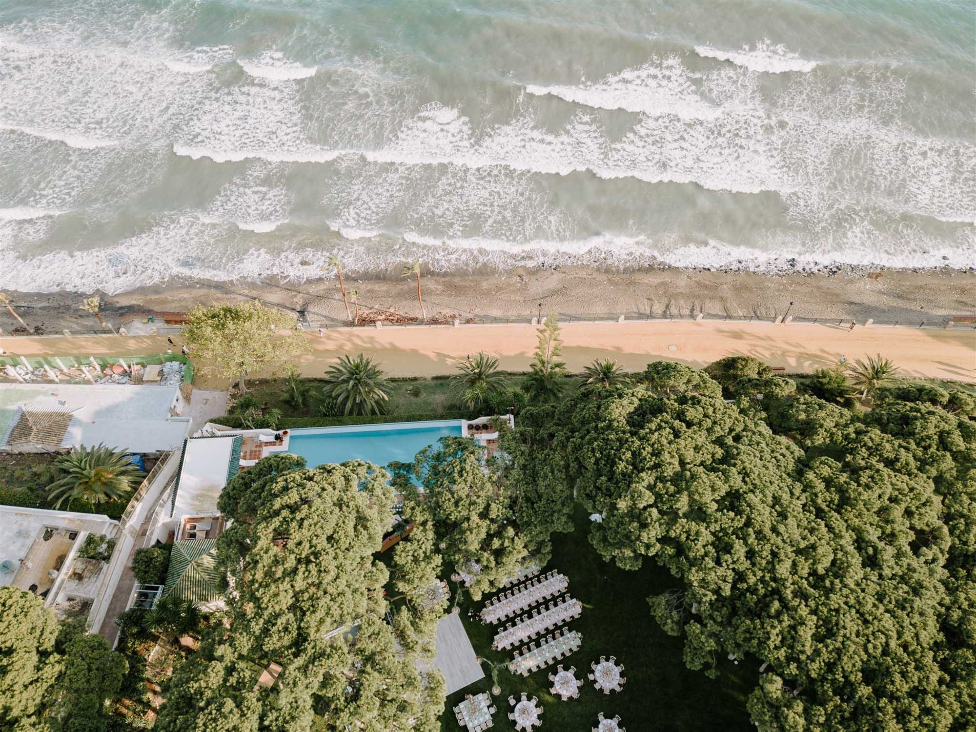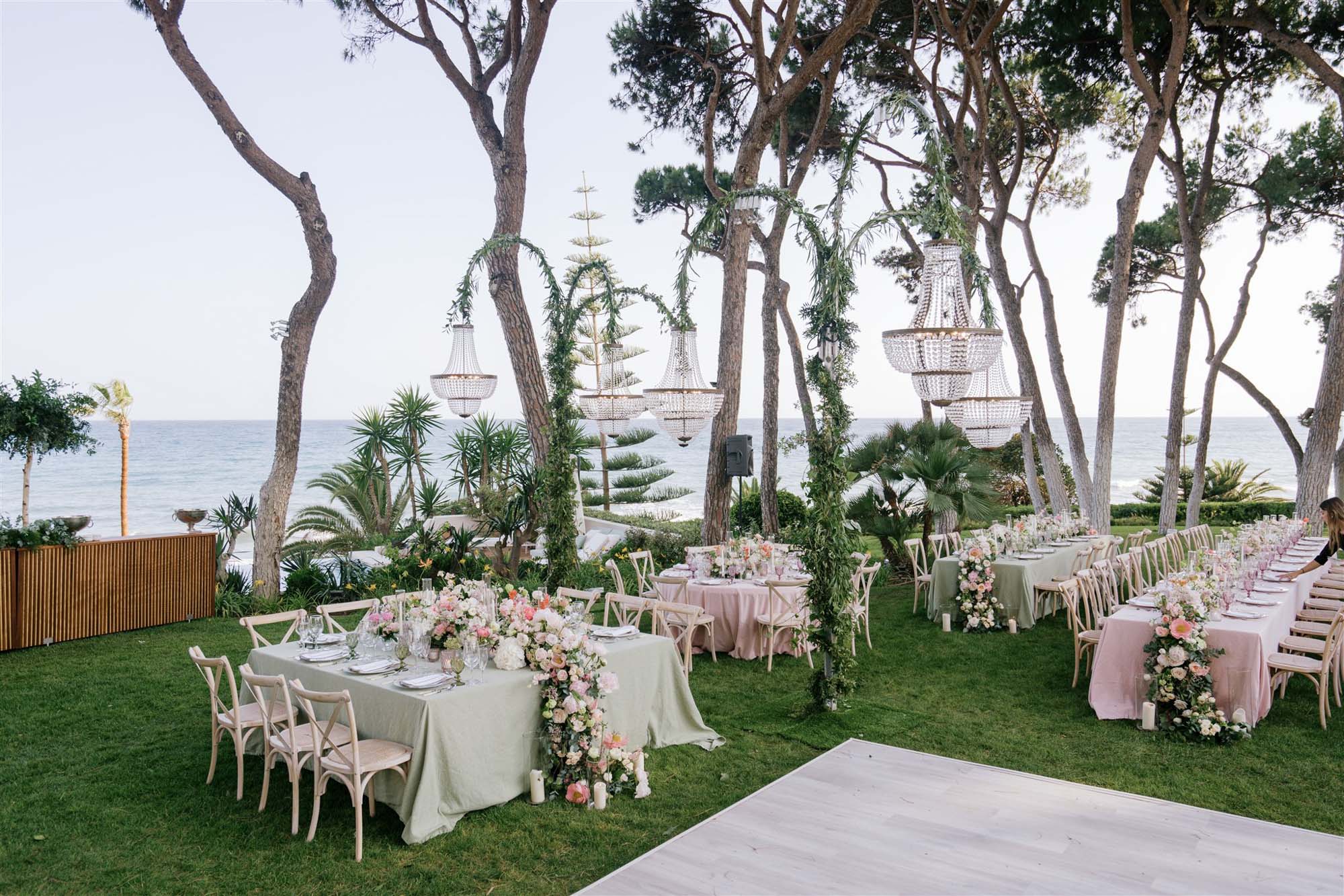 Villa Sirenique’s outside spaces are characterised by an abundance of space. Rolling lawns and majestic fir trees are framed by a backdrop of glittering Mediterranean Sea, creating an idyllic space for a beachside wedding or intimate birthday party.
