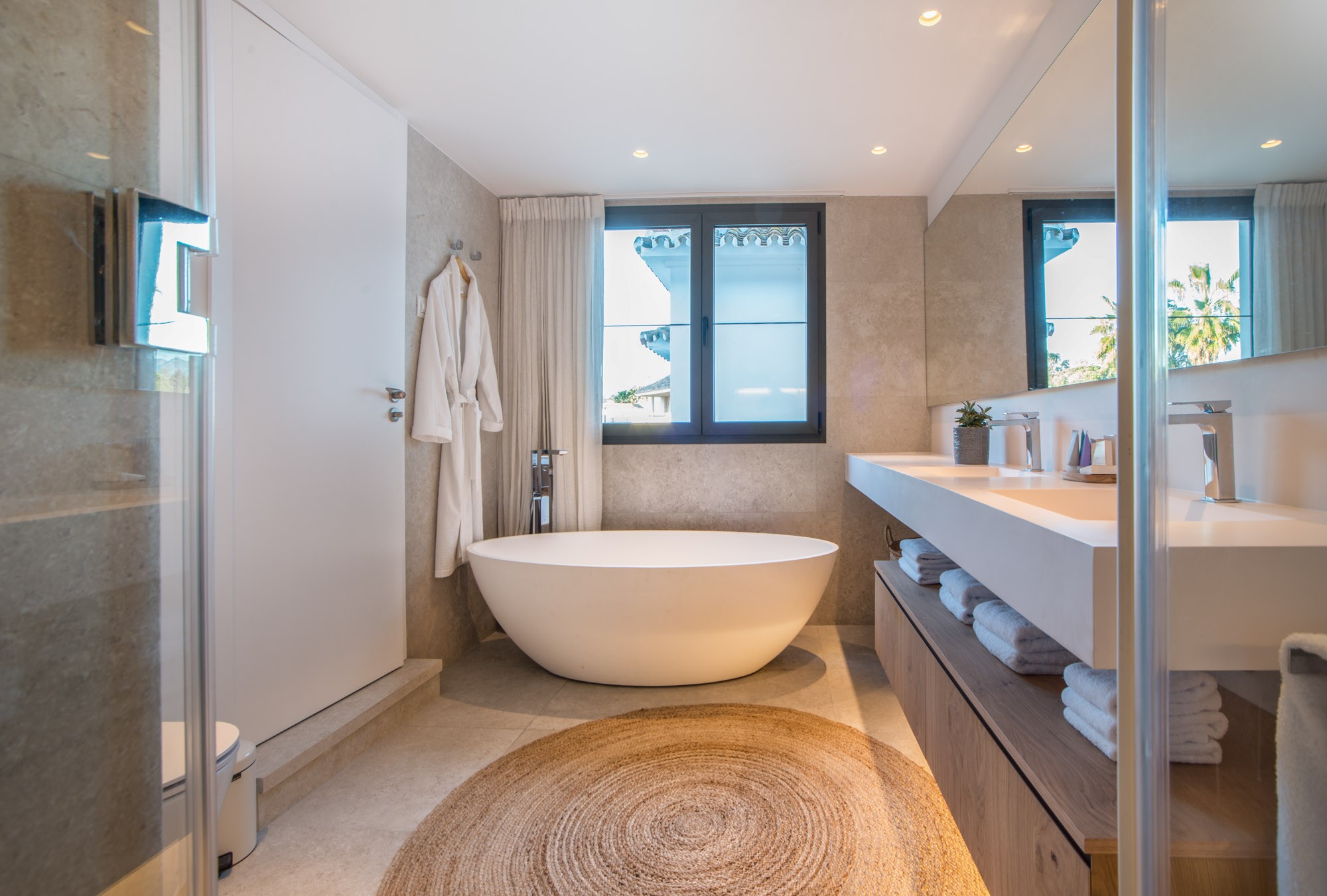 Bedroom 5: On the ground floor to the back of the villa there’s very large downstairs master suite with a custom-made 180x210cm 4 poster bed, statement seating, two wardrobes, private patio and blackout curtains with Belgium linen window coverings. The doors are wider for wheelchair access in this room. The largest bathroom has a stand-alone stone bath, shower, 2 sinks, hairdryer and heated towel rack. The sink and shower can be used by a wheelchair user. Essentiel Elements toiletries and storage as well as a safe.