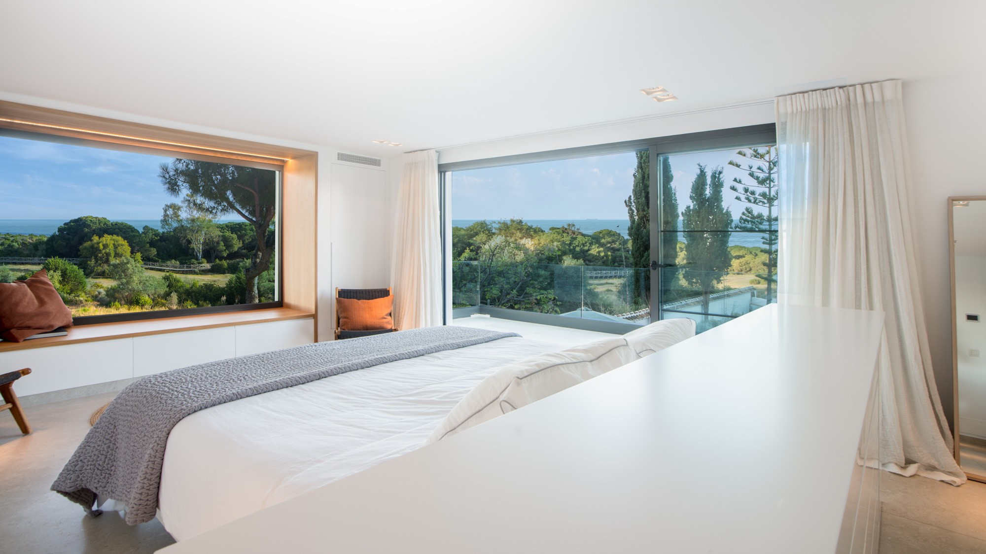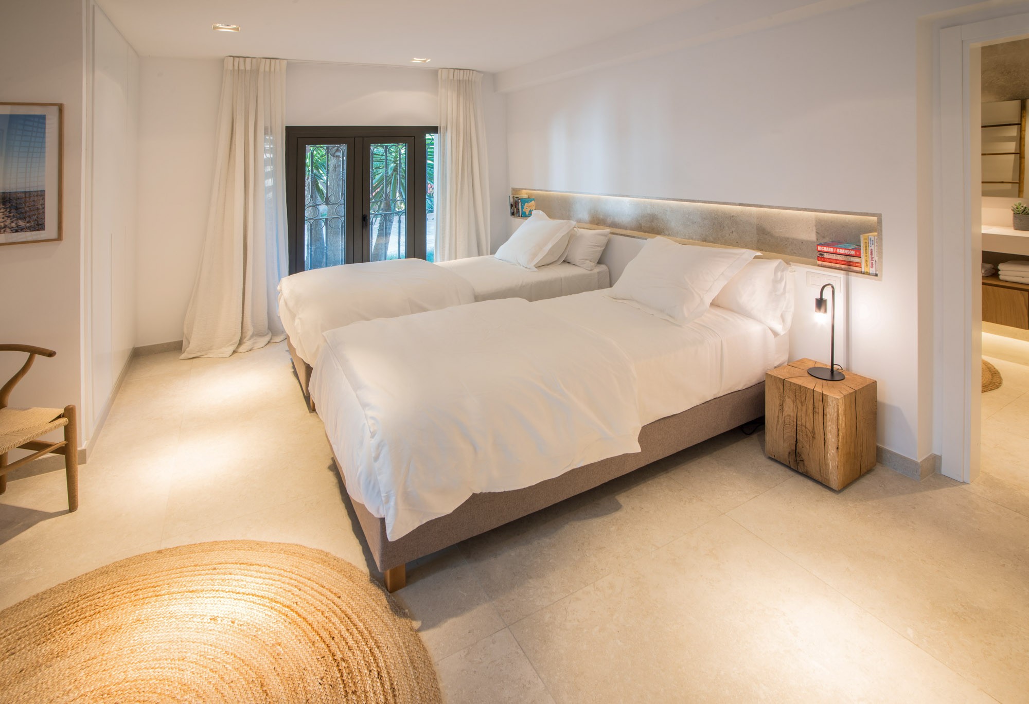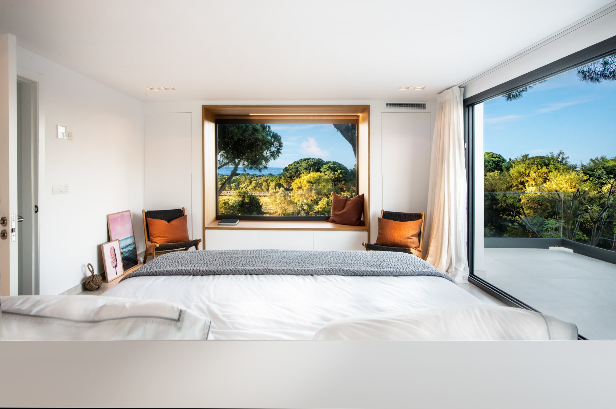 Bedroom 2: On the first floor, opposite bedroom 1, this generous bedroom has a spectacular picture window opposite the 180x200cm bed (can be made into two single beds if needed). There are also two sets of wardrobes and huge terrace over the central patio with 2 loungers. The bathroom has a single sink, large walk-in shower, heated towel rack, hairdryer, Essentiel Elements toiletries and also has access to the terrace. This bedroom also has safe.