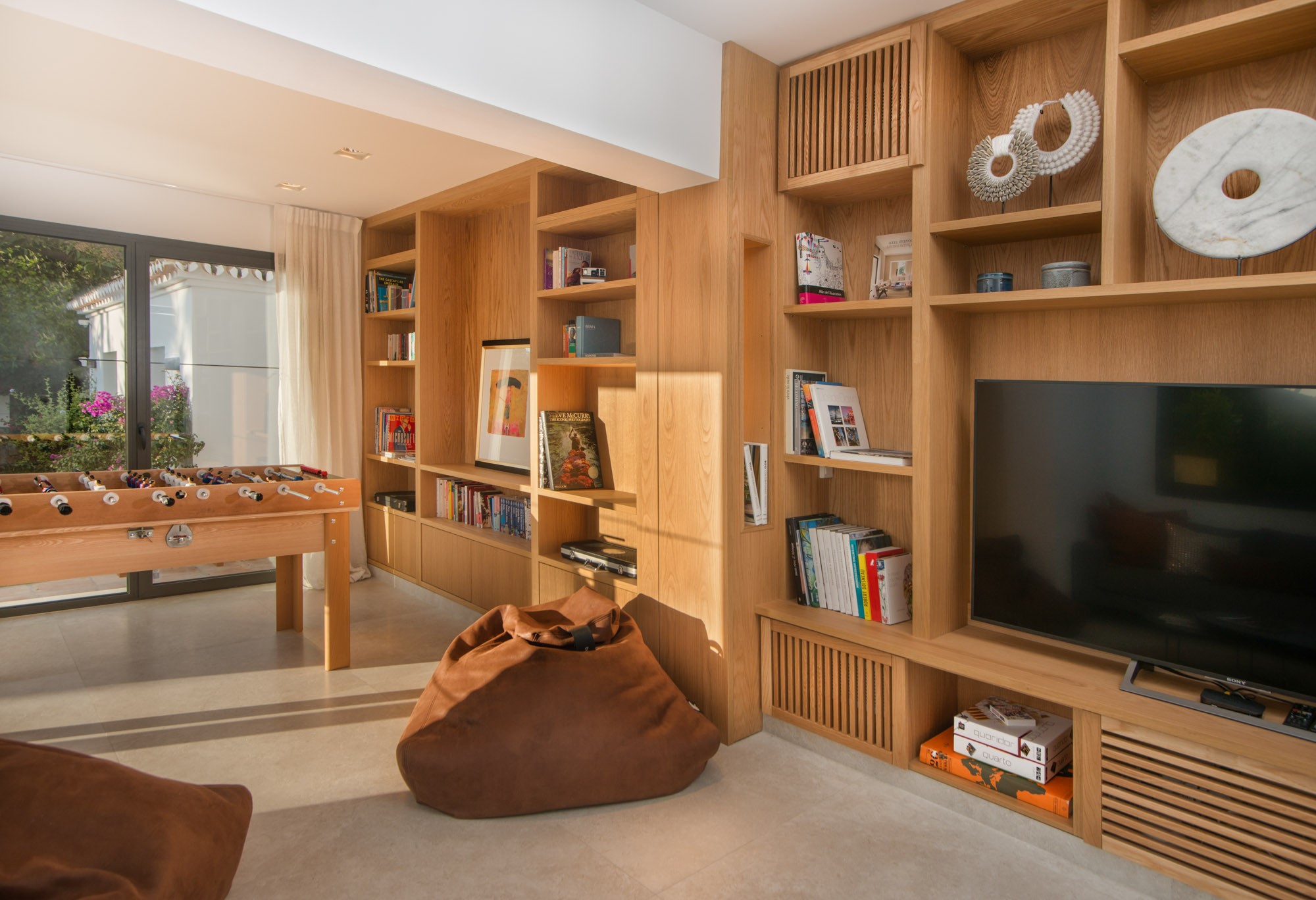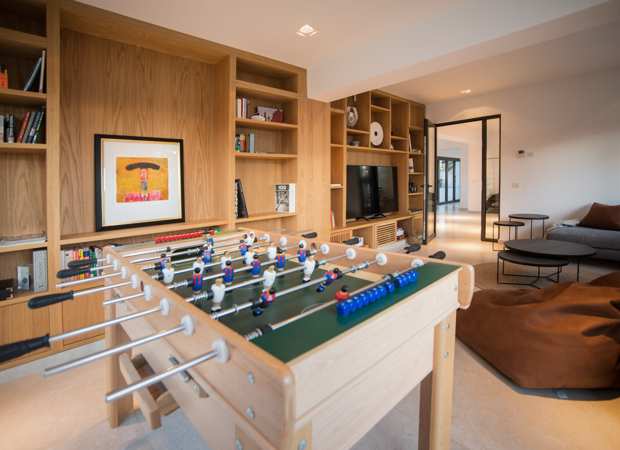 To escape the sun there’s a TV room with a football table which leads to the lawned garden next to the pool area and sauna.