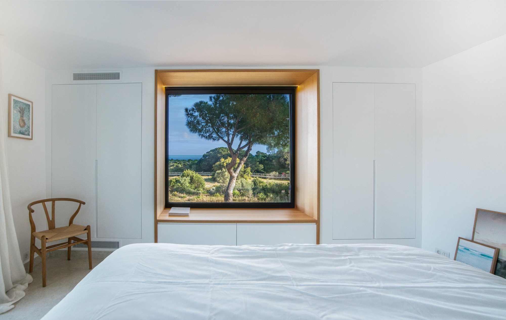 Bedroom 1: On the 1st floor with its own staircase for bedroom 1 and 2. This is the upstairs master bedroom with a south west facing terrace towards the pool, south picture window with views towards the sea and dunes and large dressing area. The bed is custom-made 200x210cm facing towards the picture window. There are two seats and plenty of storage. The terrace from the bedroom has two loungers and lovely sunset views. There are blackout curtains with Belgium linen in all bedrooms and the picture window has electronic shutters. The bathroom has a stone stand-alone bath, two sinks, large walk-inshower, heated towel rack, hairdryer. Essentiel Elements toiletries and lots of storage as well as a safe.