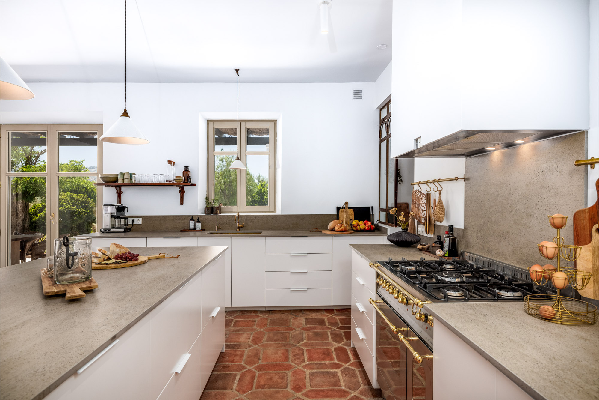 Villa Sofia’s stunning farmhouse kitchen effortlessly combines original features with modern amenities, such as sleek Dekton countertops, a gas burning LOFRA aga, coffee machine, oven and wine fridge.
