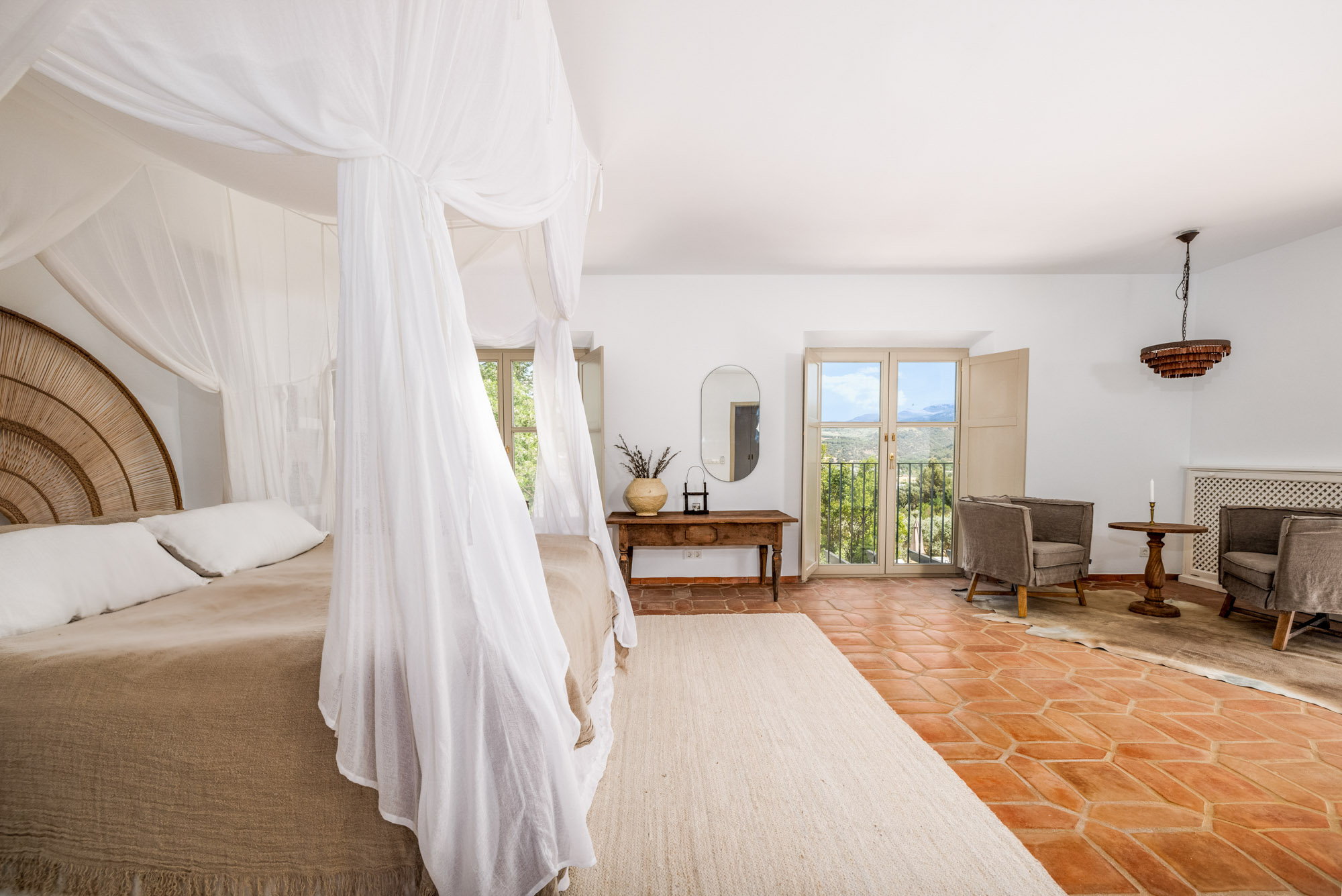 Located on the first floor, accessed via library or central courtyard. Large double room with 180x200cm super-king size bed and views over olive groves.