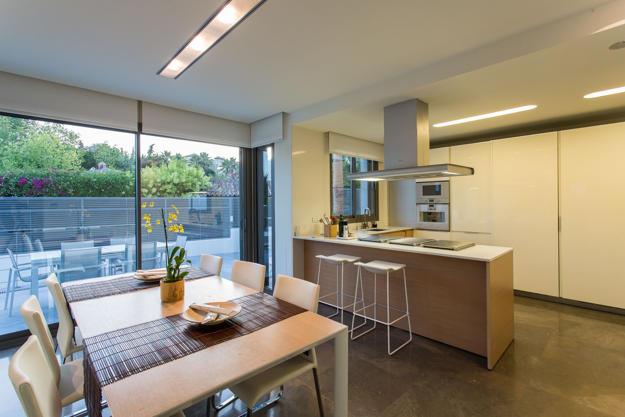 The kitchen is as sleek as you’d expect from a villa designed by Norwegian owners, while being cleverly compact. You’ll find a huge side-by-side fridge-freezer complete with ice machine, a larder handily ready-stocked with essentials, as well as a steam oven, teppanyaki cooktop and smoothie machine. You have the choice of eating in the kitchen, or outside on the terrace, overlooking the pool.