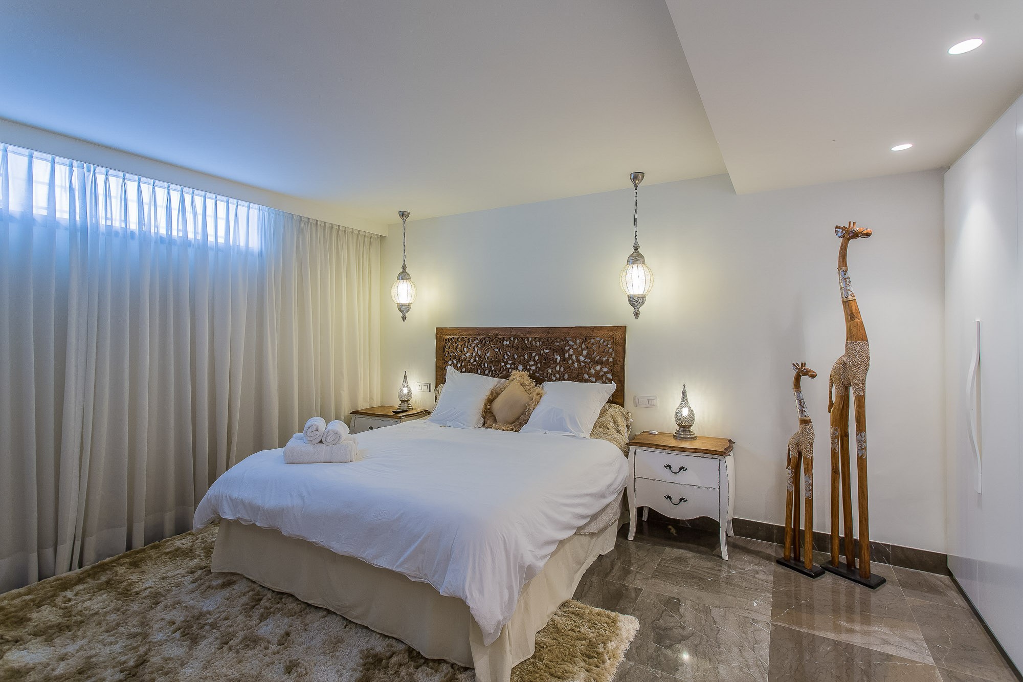 One of the lower bedrooms has an exquisite carved wooden headboard, hanging lamps and Moroccan vibe and 55-inch TV, the other is finished with a soft grey, feminine theme.