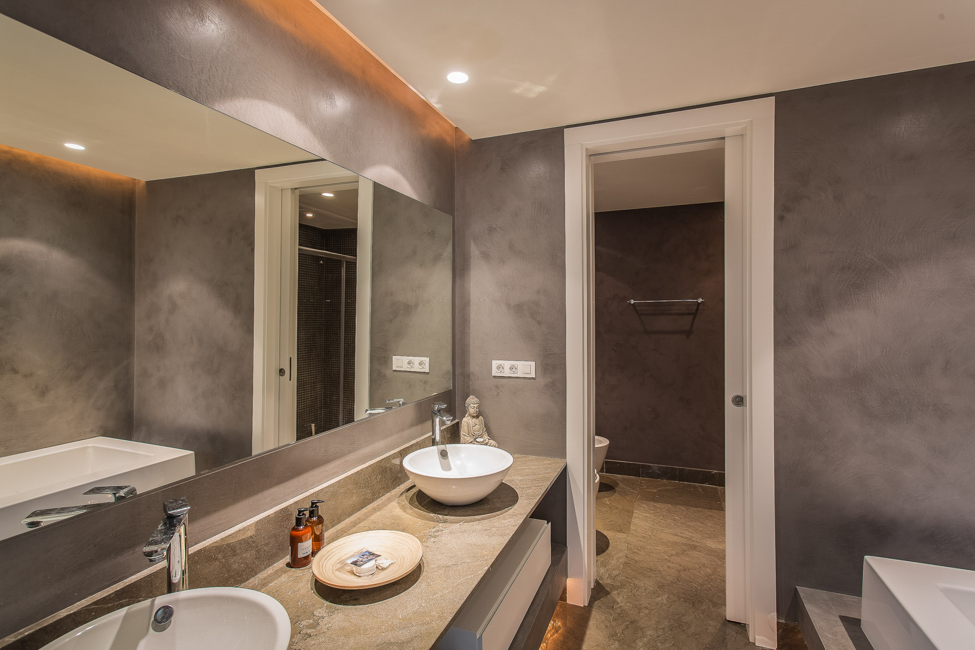 These rooms share a bathroom – ideal for children, or children and a nanny – with chic, matt grey-coloured micro-concrete walls, featuring twin sinks, bathtub and separate shower. All bedrooms have first-class mattresses for premium sleep quality, and cosy rugs on the floor.