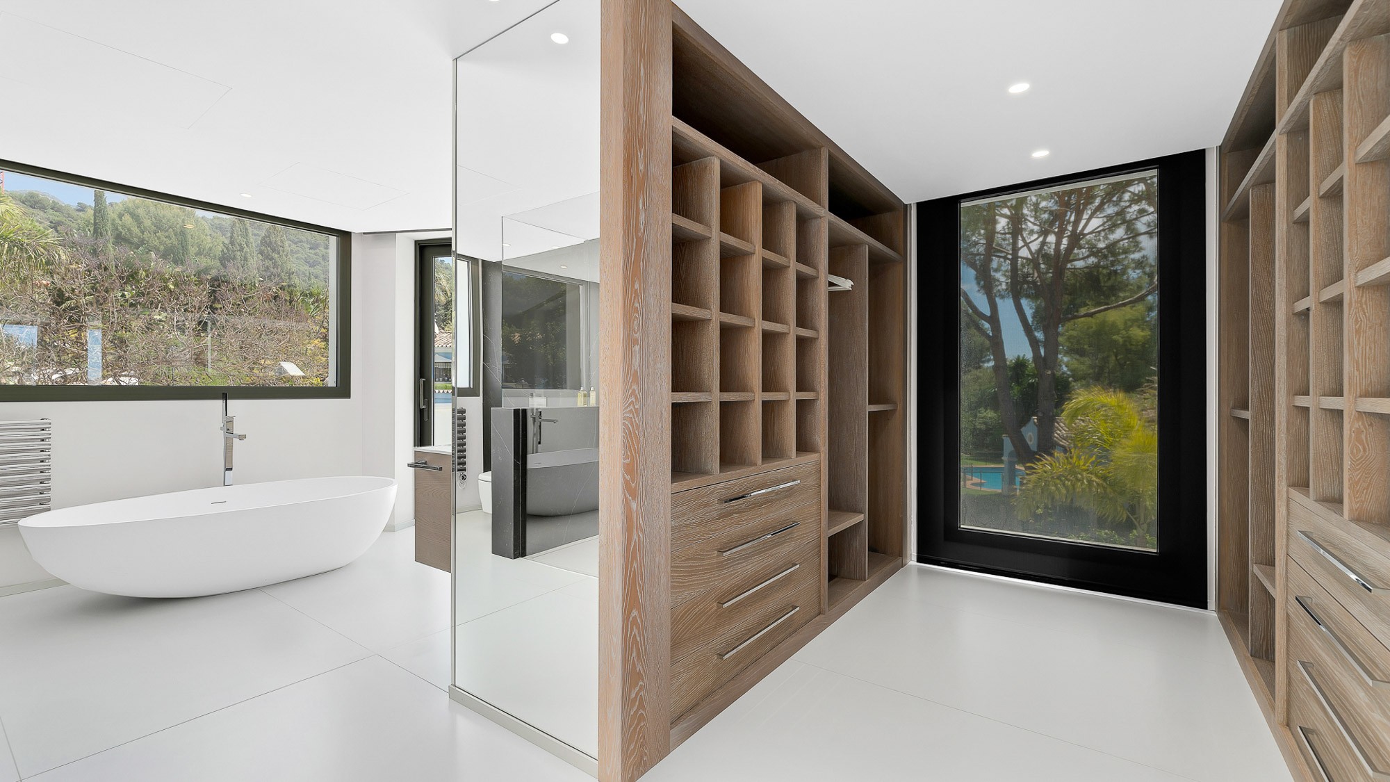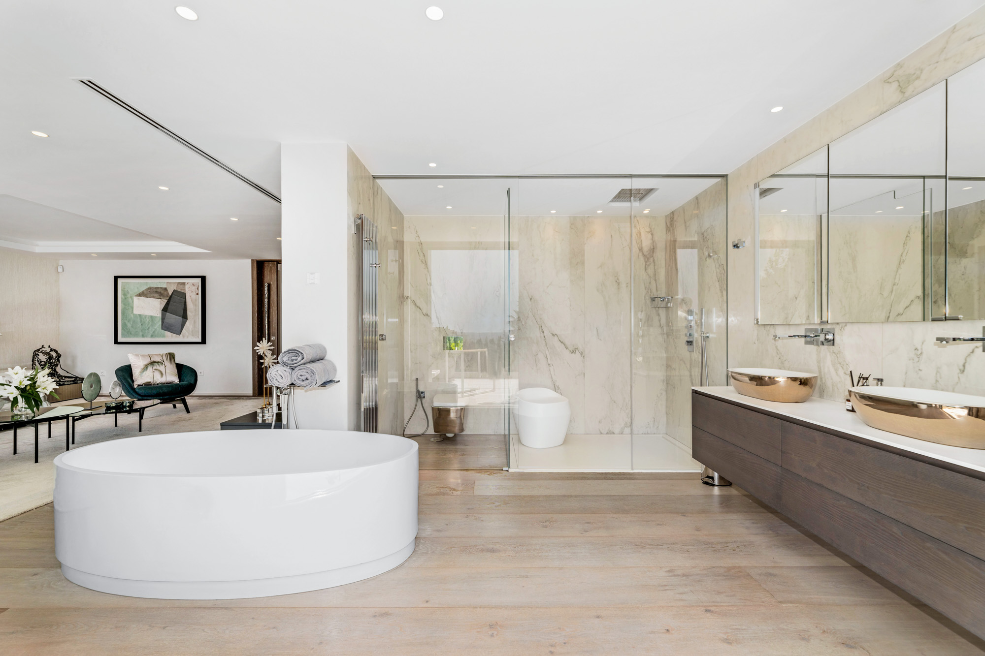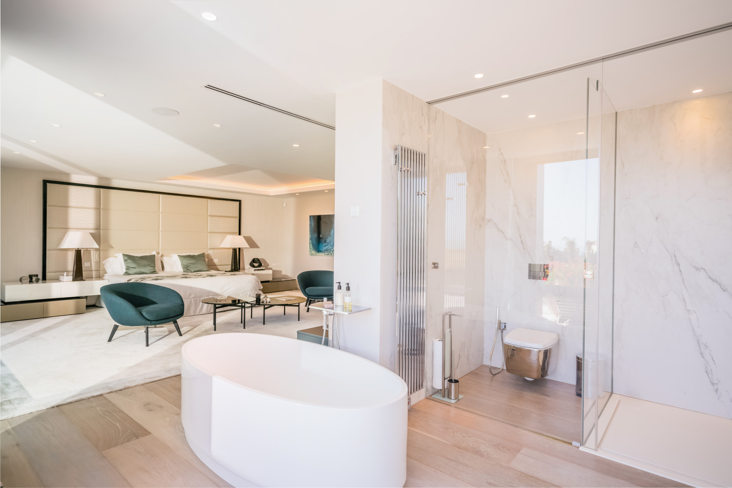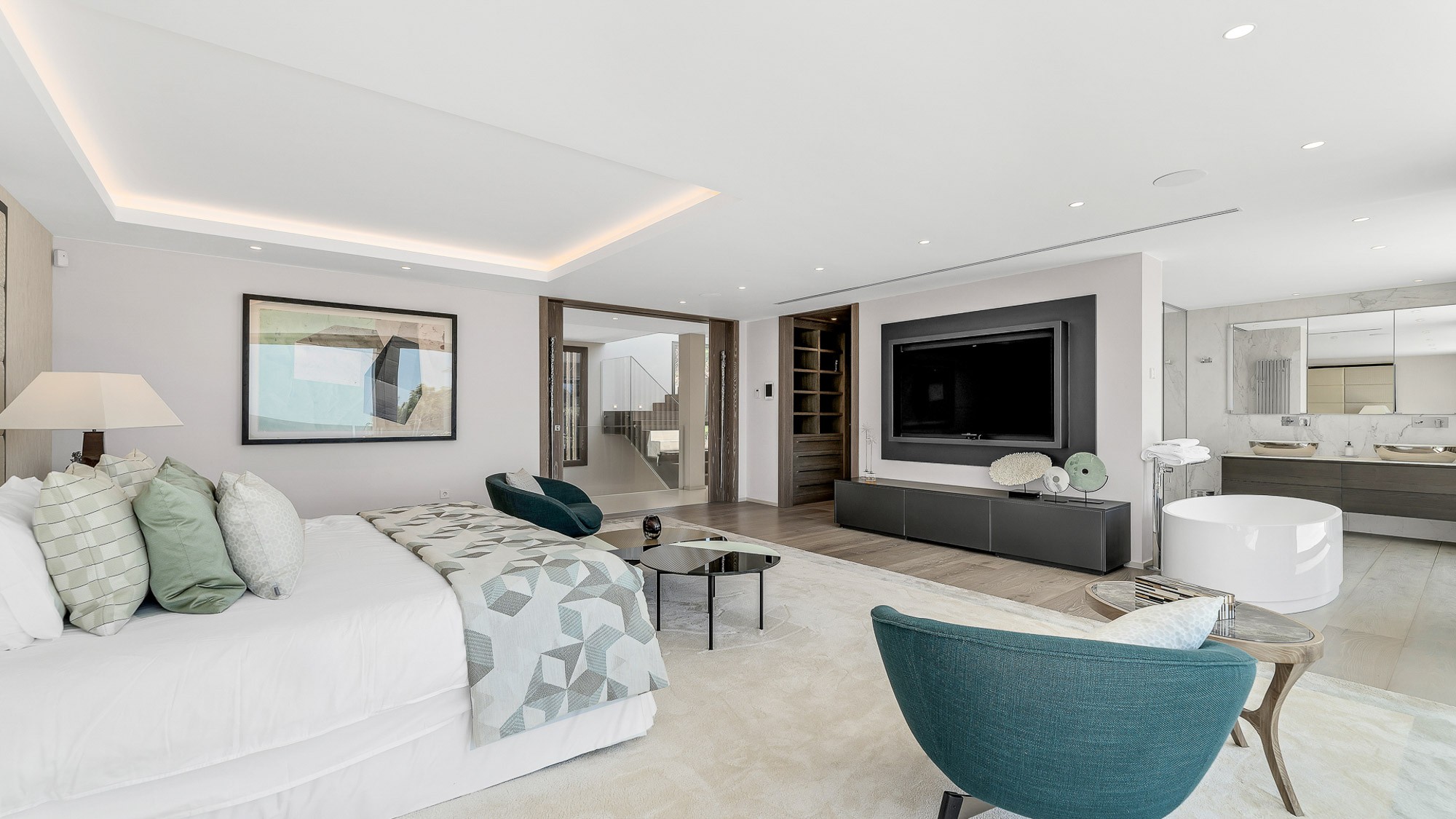 Bedroom 4: The only bedroom on the ground floor is a large, light-filled, spacious and neutral room with super-king bed (180 x 200cm) with dark headboard, fitted wardrobes and TV. Triple aspect, sliding doors lead out on to the main terrace. The en-suite bathroom has a walk-in shower, dual washbasins, toilet, while there’s a free-standing oval bath in the bedroom itself.