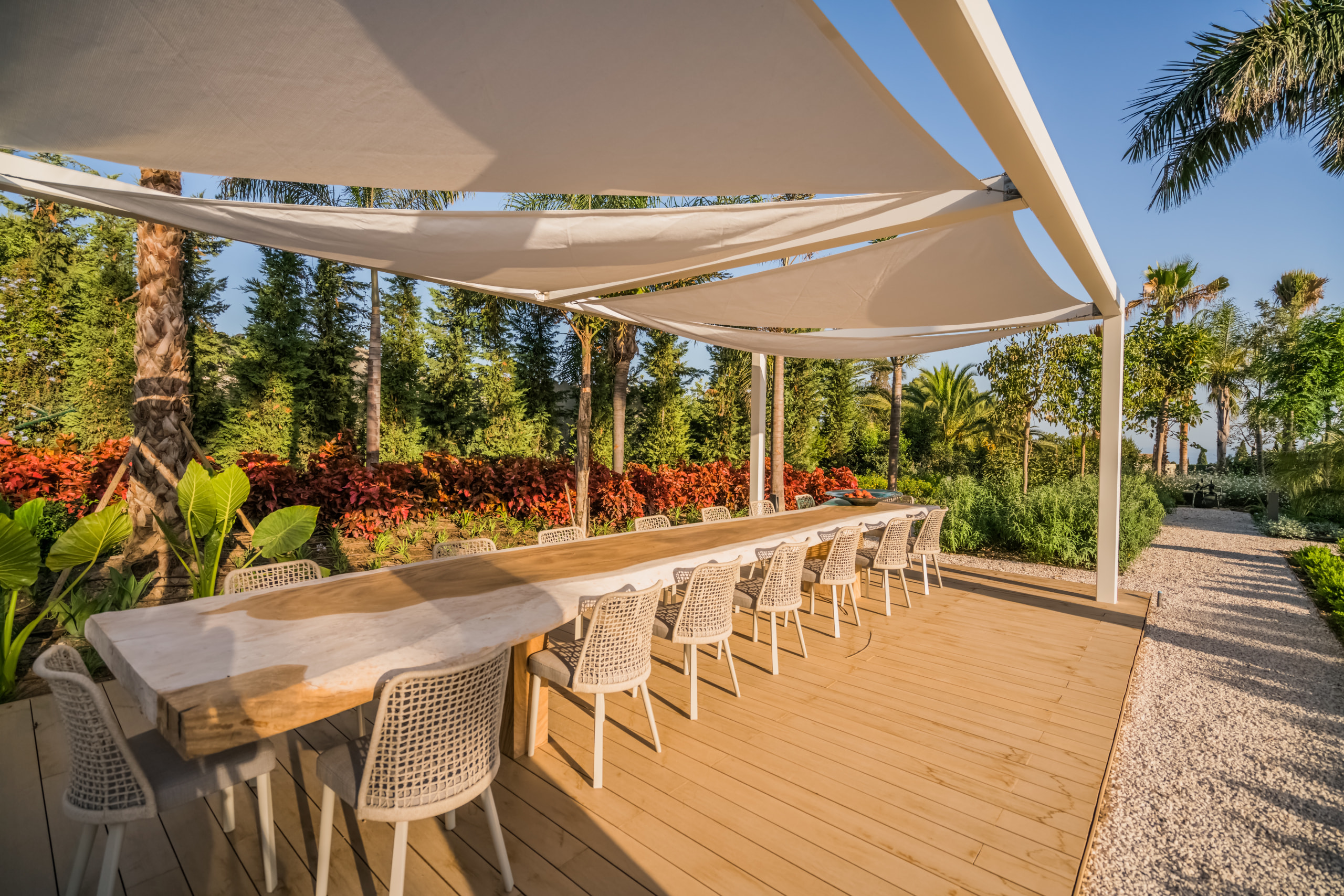 Alongside the pool and next to the kitchen/bar area is the main outdoor dining space under a shady pergola. It sits 20 comfortably.