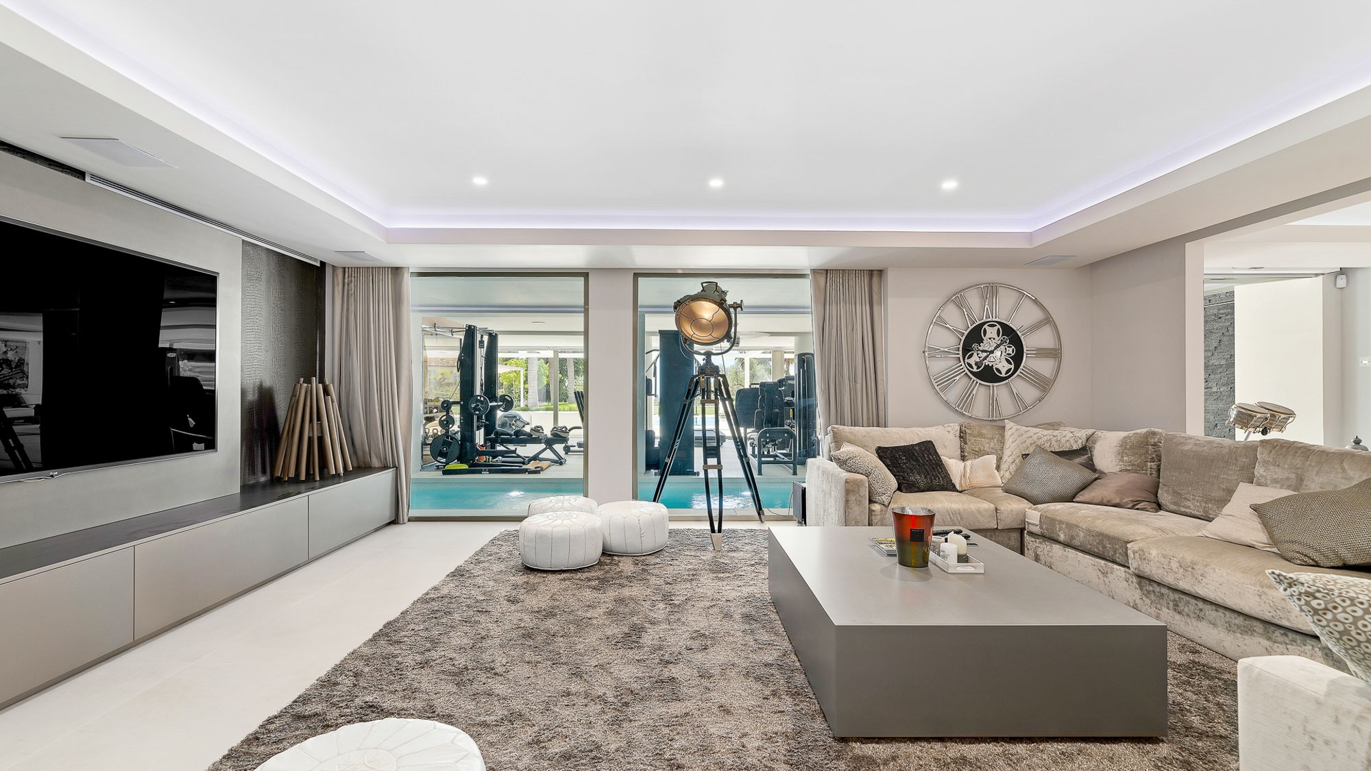 Just off the outdoor pool area and adjacent to the gym there’s a music area complete with black Baby Grand piano, three Gibson guitars, saxophone, full drum kit and DJ decks. Behind the gym and music area is an indoor bar area, wrap-around velvet sofa and large TV. A table tennis table available outside if required.
