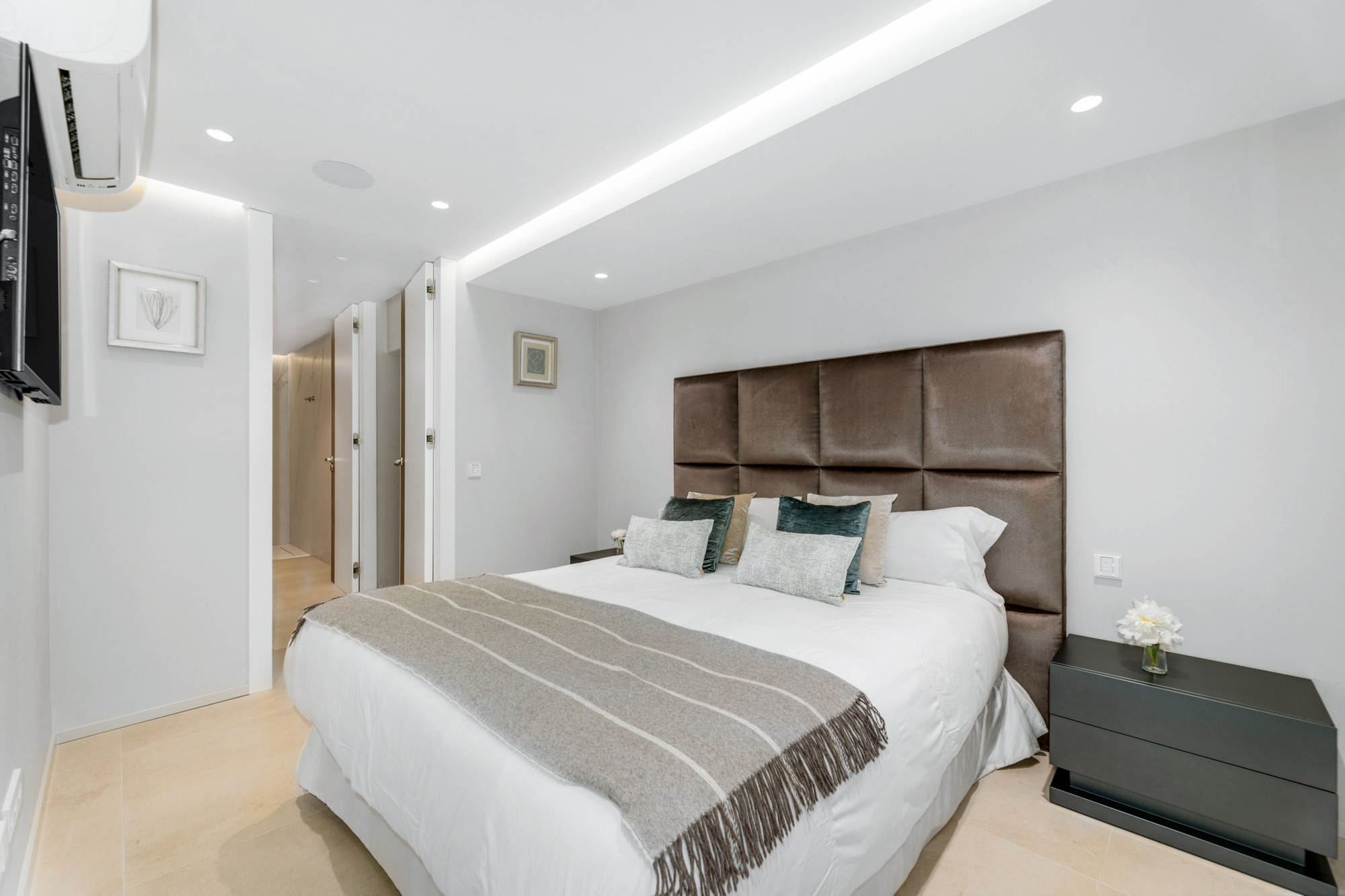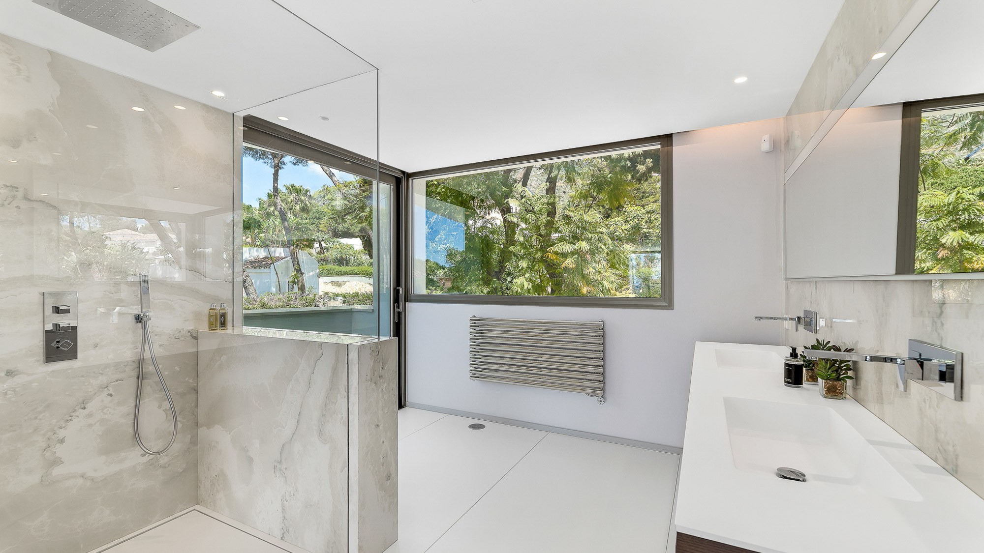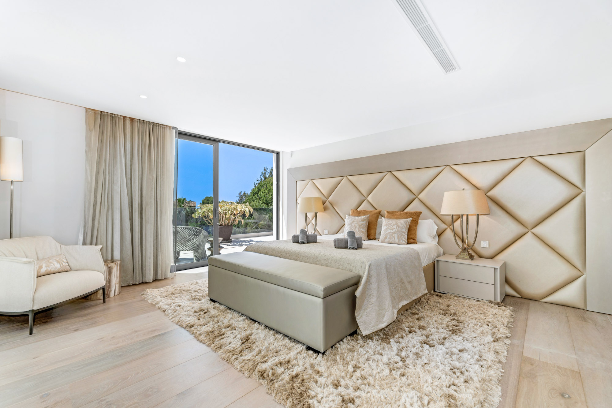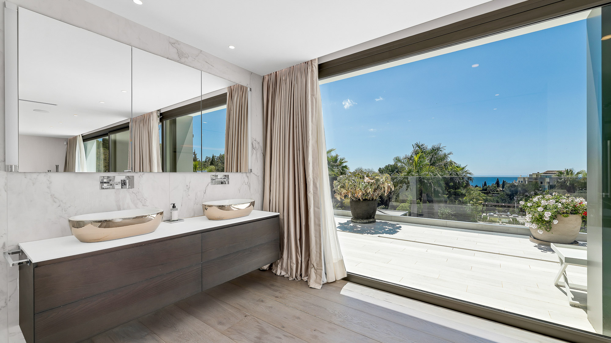 Bedroom 2: A 1st floor room with a super-king bed (180 x 200cm), black leather headboard, velvet wall, monochrome soft furnishings, TV and fitted wardrobes. It comes with views of La Concha at the rear and sea views to the front, together with access to the main sun terrace (shared with master suite and bedroom 3). The bathroom has a walk-in shower, toilet and dual washbasins. A small, private terrace has an outdoor shower and toilet.