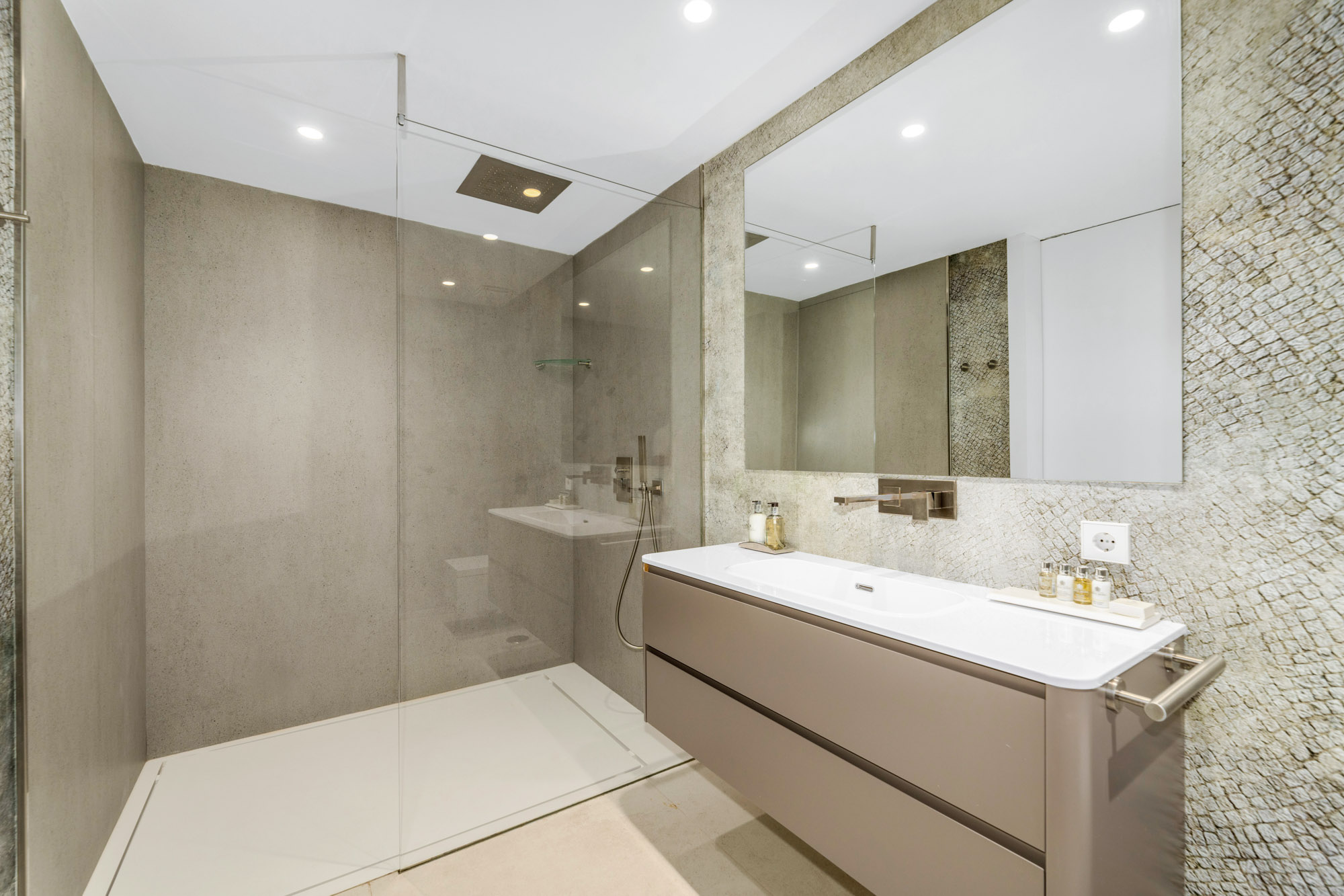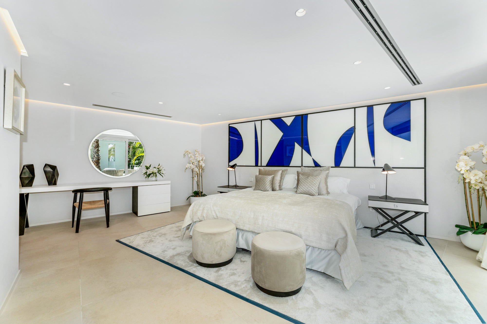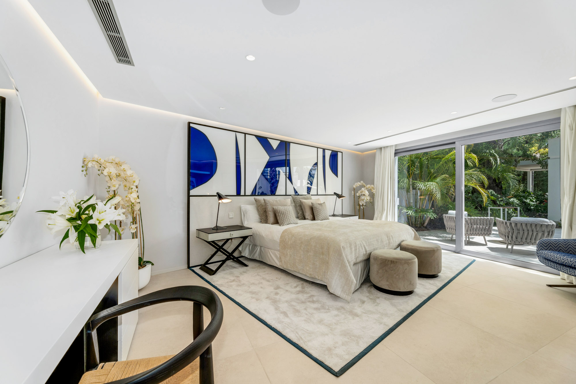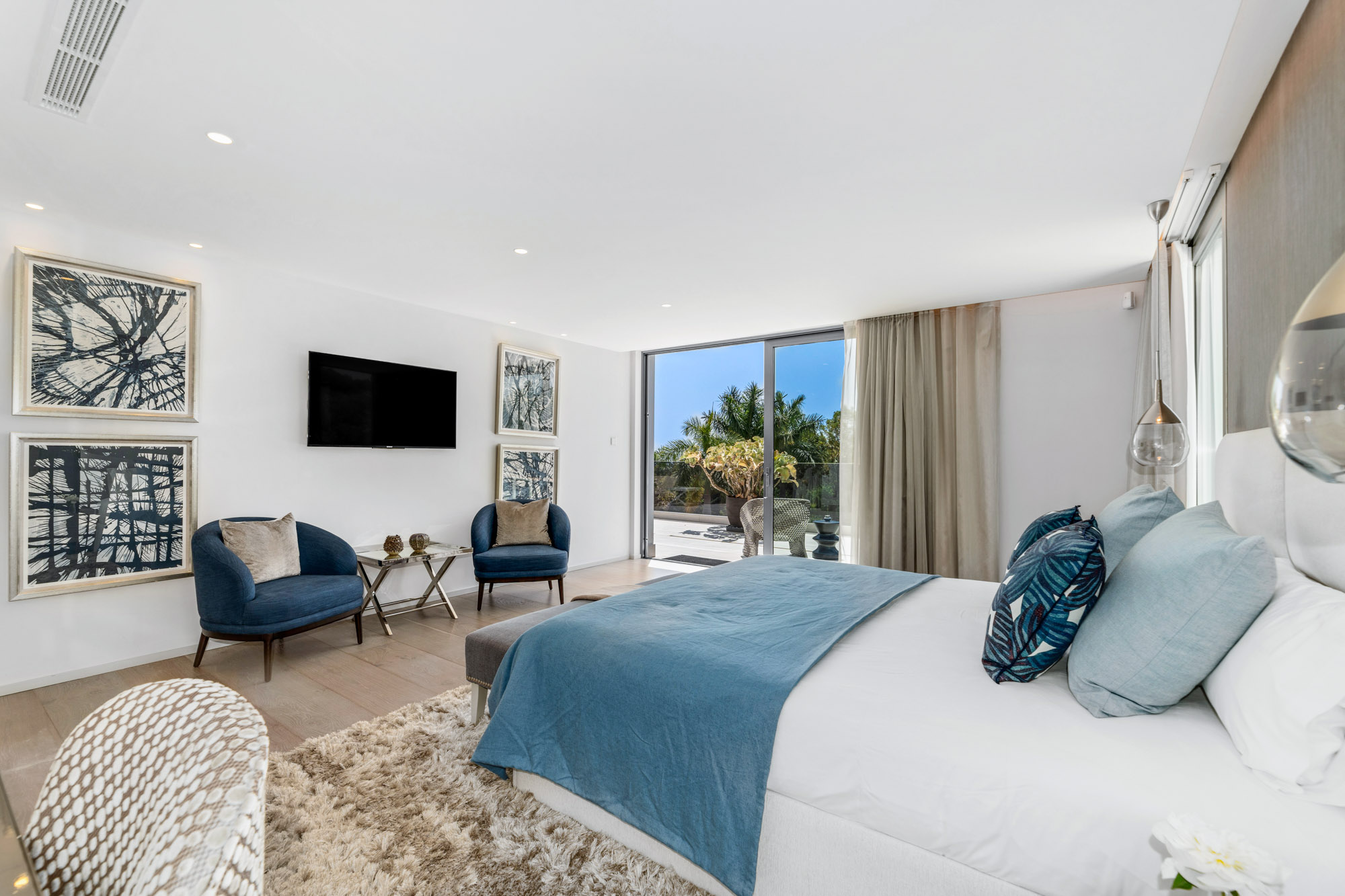 Bedroom 2: A 1st floor room with a super-king bed (180 x 200cm), black leather headboard, velvet wall, monochrome soft furnishings, TV and fitted wardrobes. It comes with views of La Concha at the rear and sea views to the front, together with access to the main sun terrace (shared with master suite and bedroom 3). The bathroom has a walk-in shower, toilet and dual washbasins. A small, private terrace has an outdoor shower and toilet.
