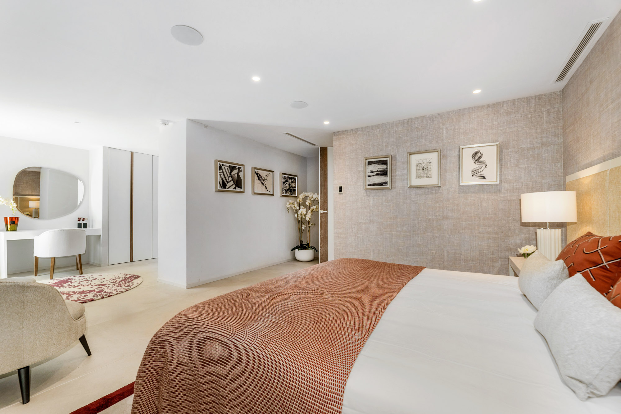 Bedroom 7: A rear lower ground floor bedroom with super-king bed (180 x 200cm) and doors out to a square courtyard for light. Comes with an en-suite bathroom containing a walk-in shower, washbasin and toilet.