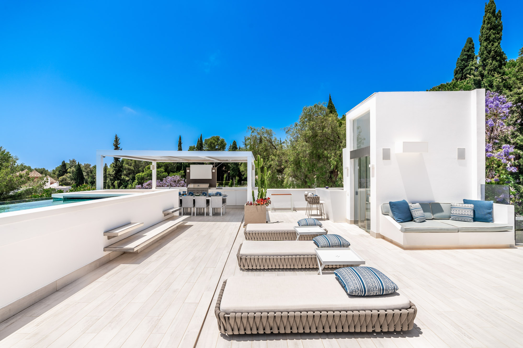 The location here is stellar. And the villa has certainly been designed to make the most of it. The front-facing bedrooms open out onto long, lounger-lined terraces, while at the top of it all, crowning the villa, is a rooftop kitchen/bar area and Jacuzzi*. From here you can see the pine-covered hills rising up to La Concha mountain; below, the views stretch away down to the sea.
