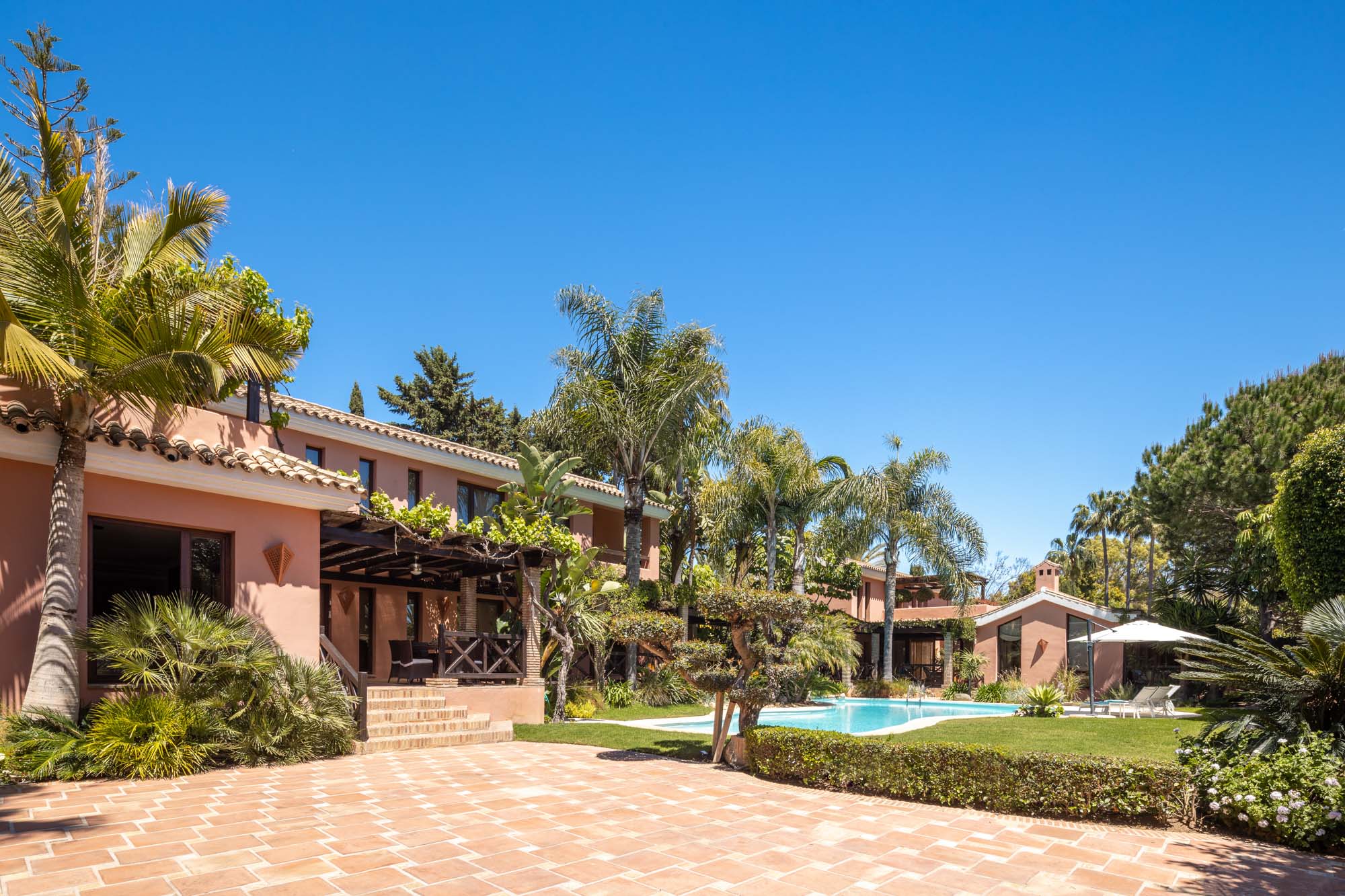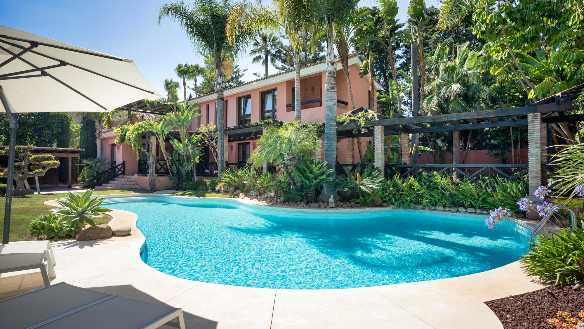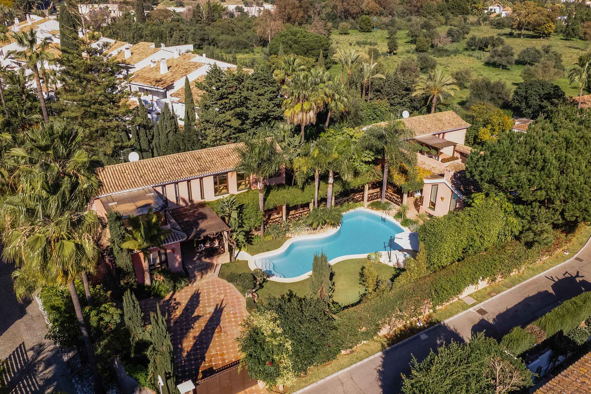 This unique property comprises two connected villas with a private pool set on a private security-gated street, between the iconic Marbella Club and Puente Romano hotels, and within an easy five-minute drive to the centre of Marbella.