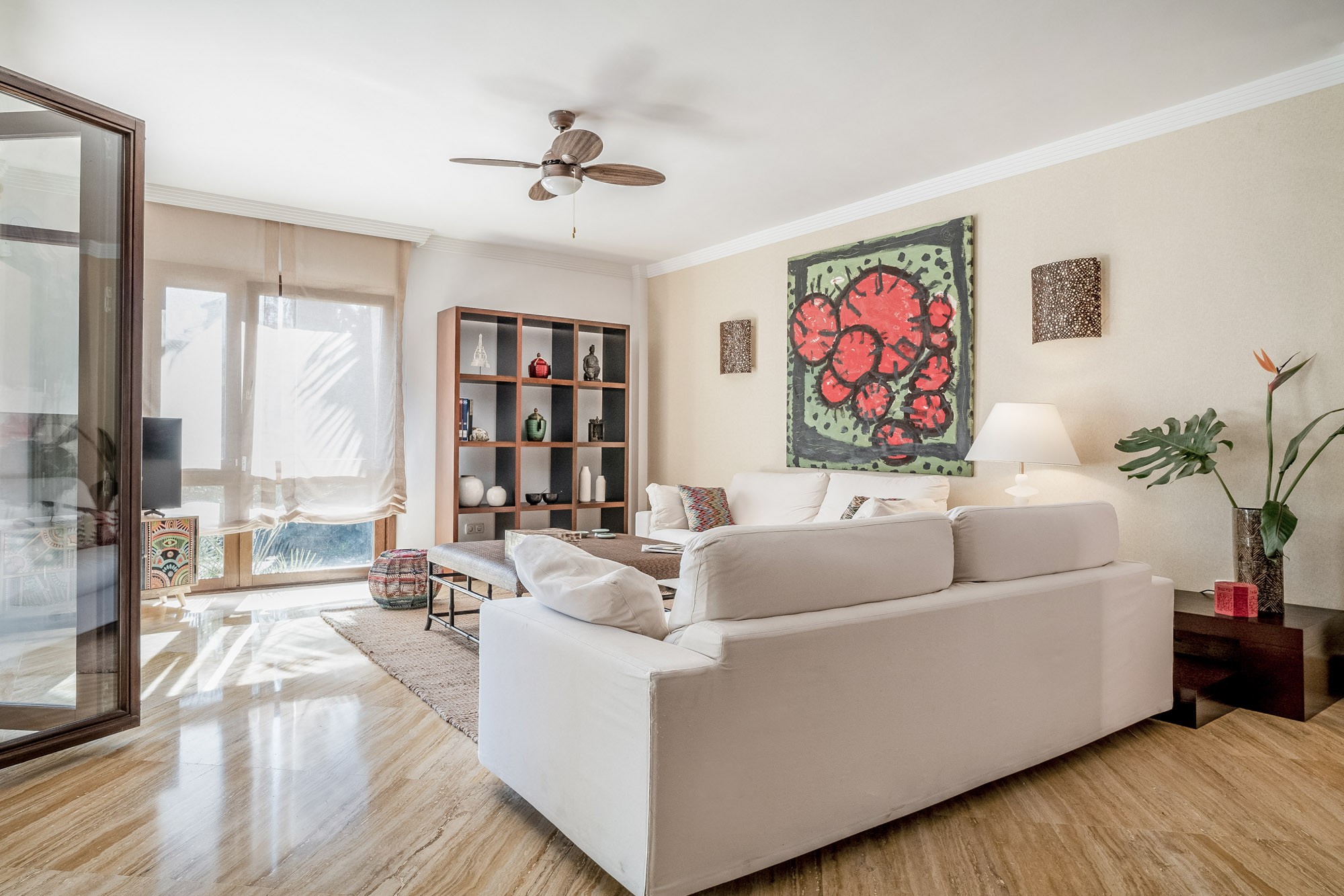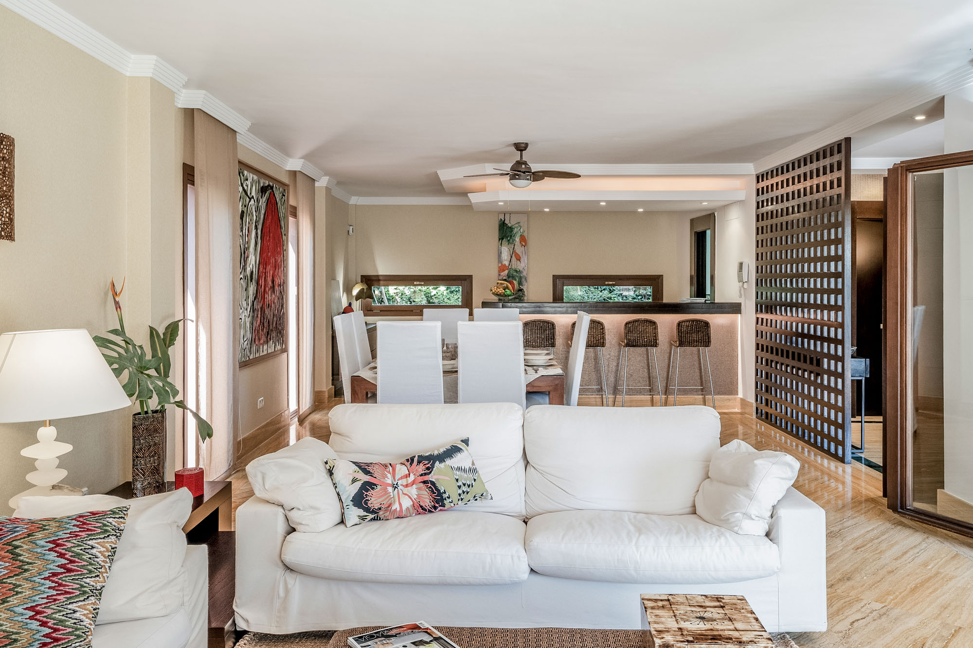 The living room in the guest house opens out to a spacious terrace and has a bright and airy contemporary feel with two immaculate white sofas, light tiled floors and modern art pieces decorating the walls.