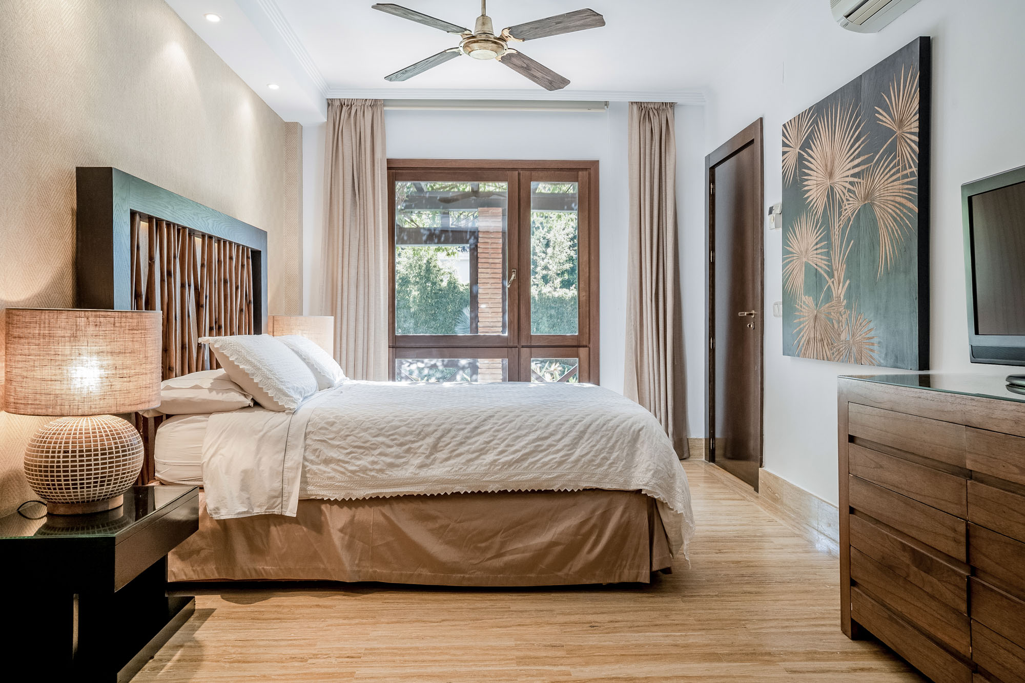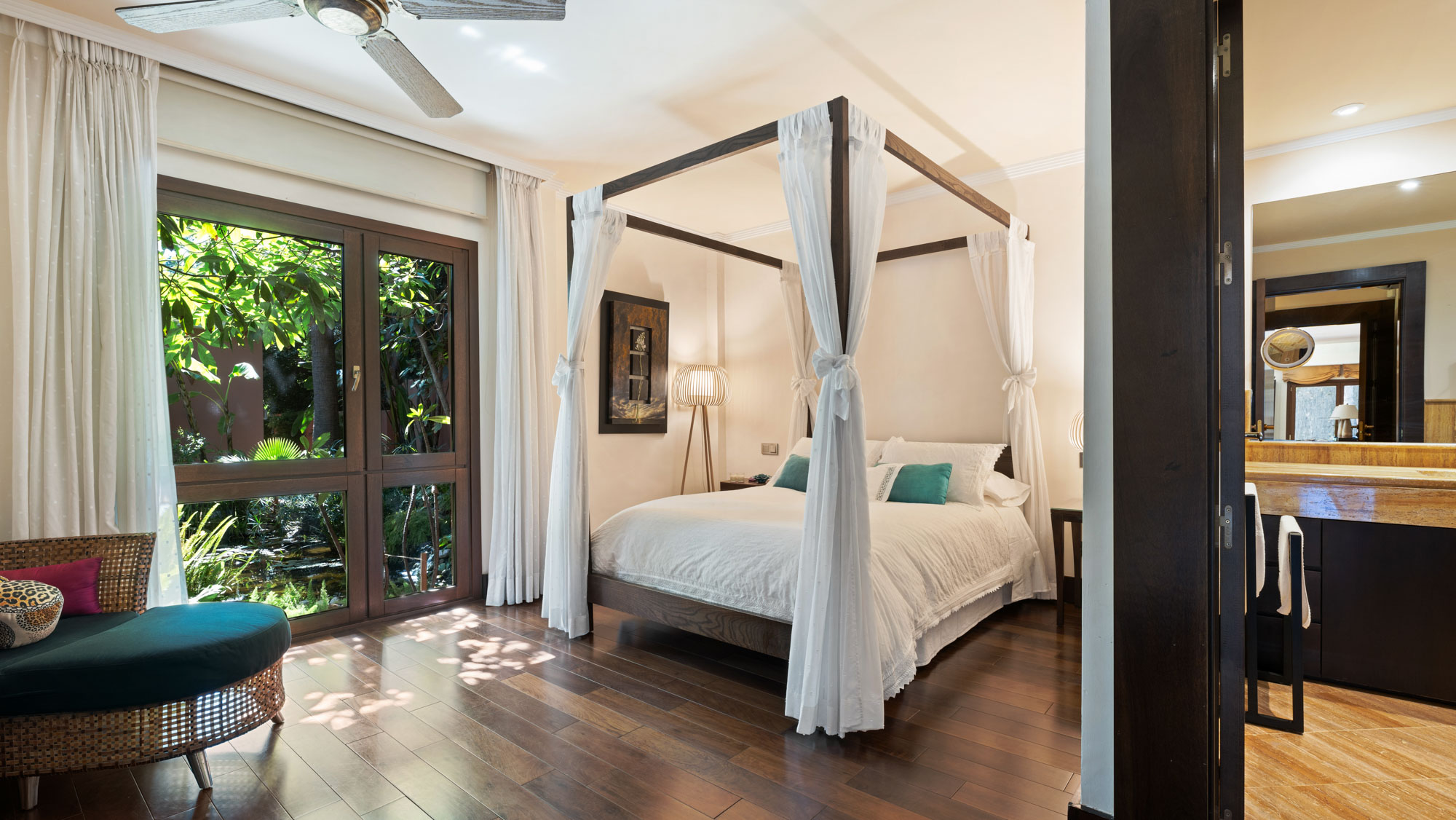 This rare and beautiful home has been lovingly curated by three generations of a very artistic family. Spacious bedrooms are spread across two villas connected by a wooden bridge, nestled in lush, tropical gardens and an inviting private pool.