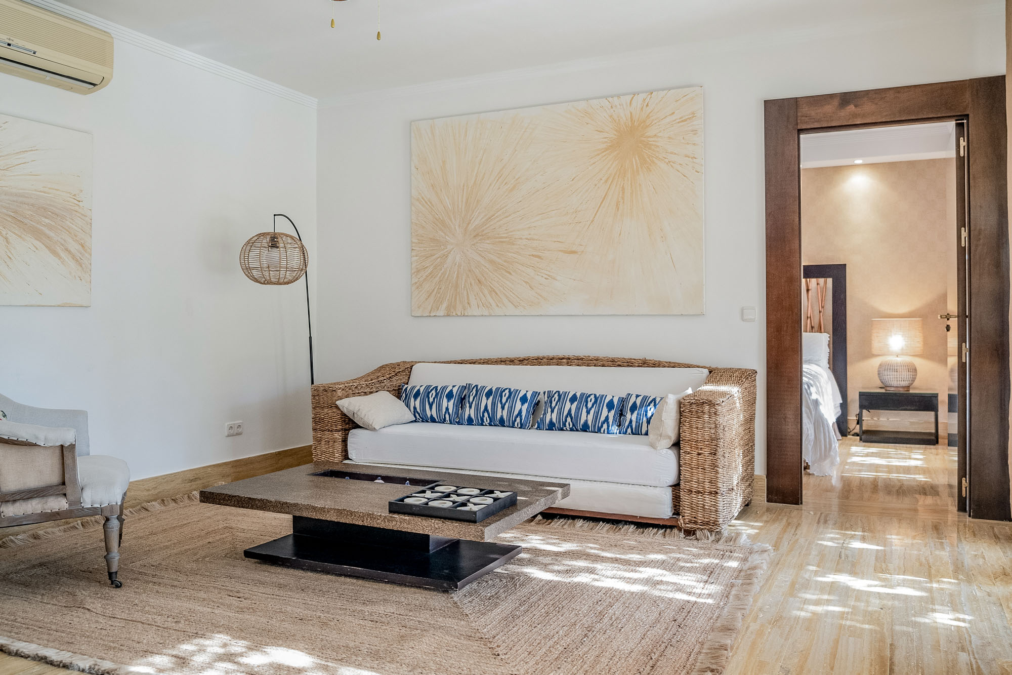 The main villa houses three of the eight bedrooms with a spacious first-floor suite and adjacent massage room, and two guest bedrooms on the ground floor. Polished teak floors flow through the ground floor accommodation and the impressive artworks may leave you speechless.