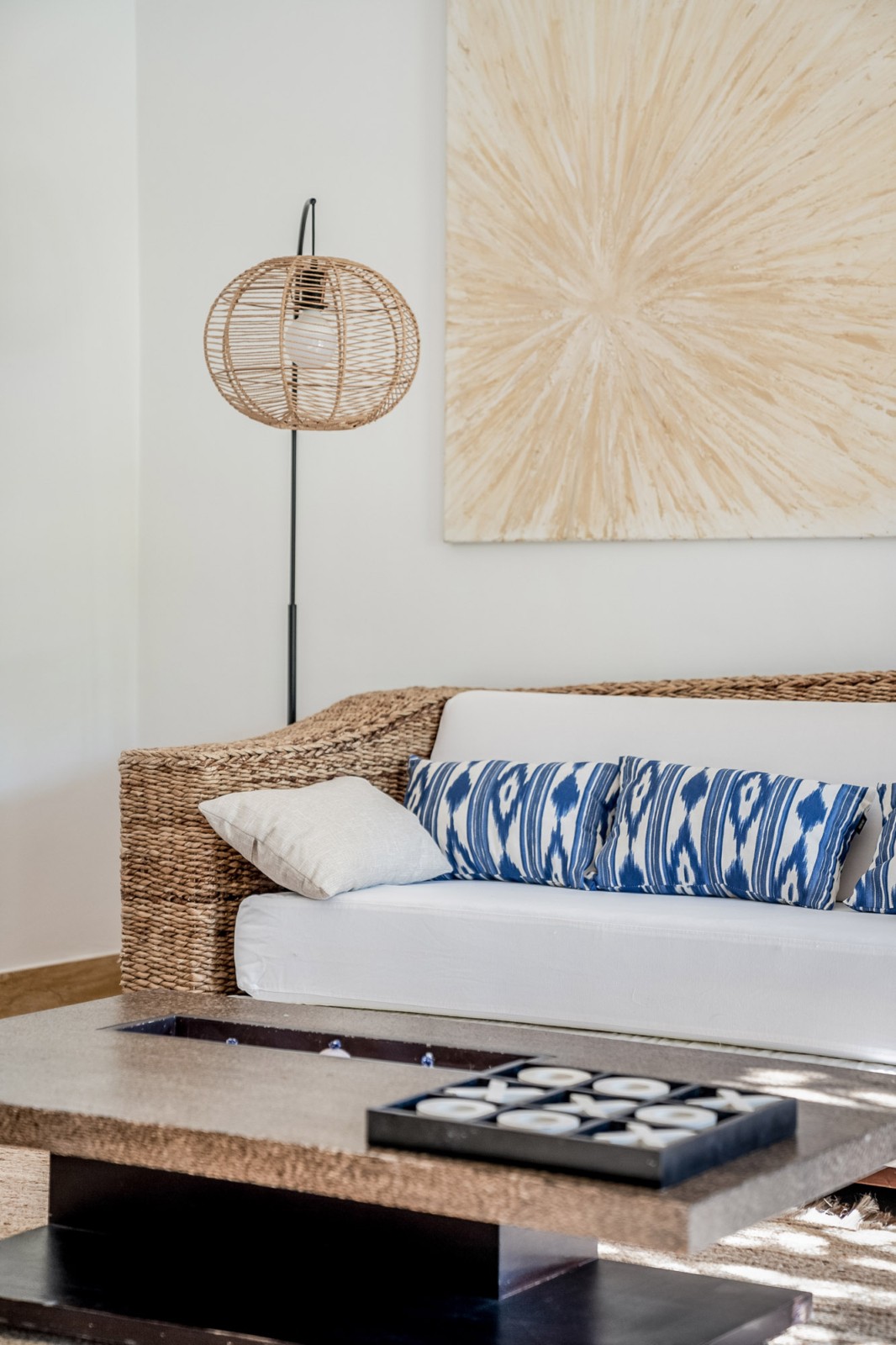 A second elevated terrace is accessed from the main entrance hall. With its wicker lounge and armchair seating, it’s the ideal reading nook.