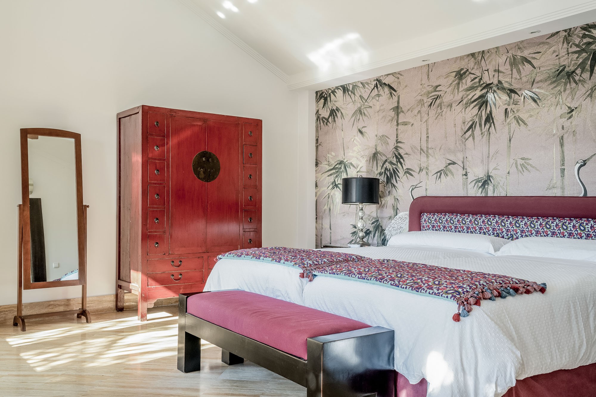 Guest Bedroom 5: Located on the first floor and furnished with two single beds (90cm) which together make a split super-king-size, a beautiful Oriental stand-up wardrobe and chest of drawers, smart TV, 2 bedside cabinets. A private large terrace overlooks the gardens and features a telescope.