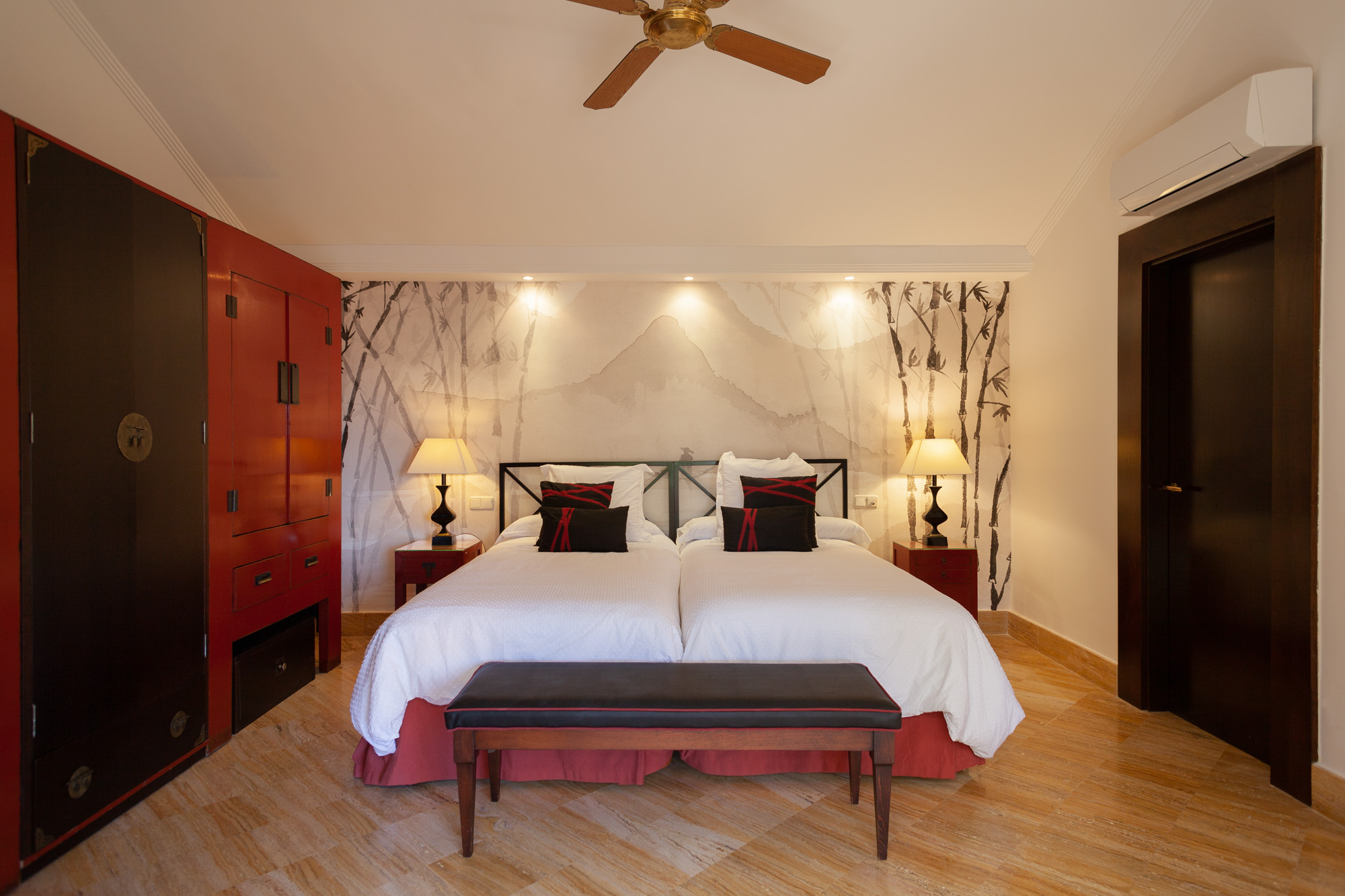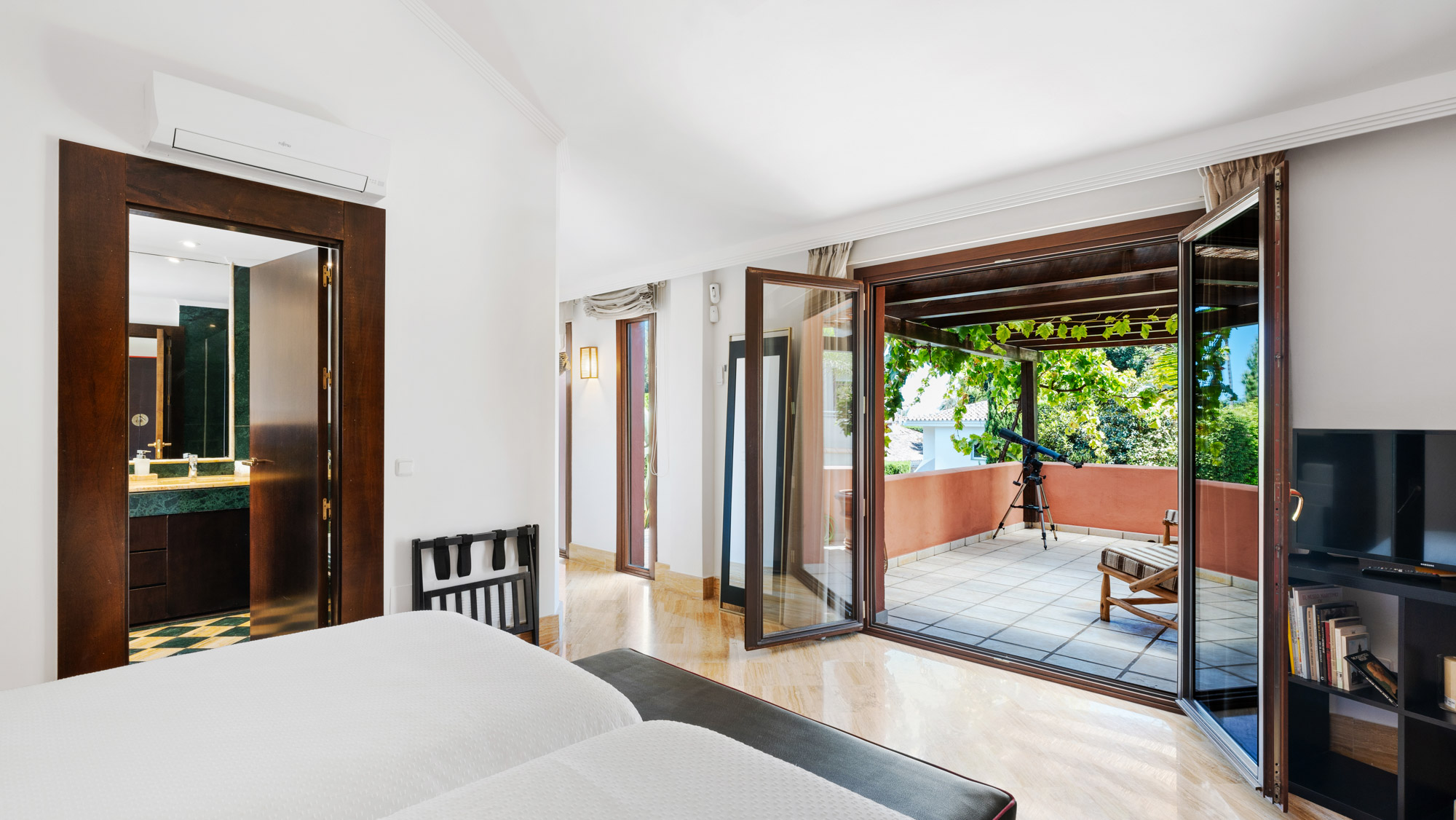 Guest Bedroom 6: Located on the first floor and furnished with two single beds (90cm) which together make a split super-king-size bed, an ottoman proudly sits at the foot of the bed, a wardrobe, 2 bedside cabinets, a chest of drawers, smart TV and ceiling fan. A private, large terrace overlooks the gardens and pool.