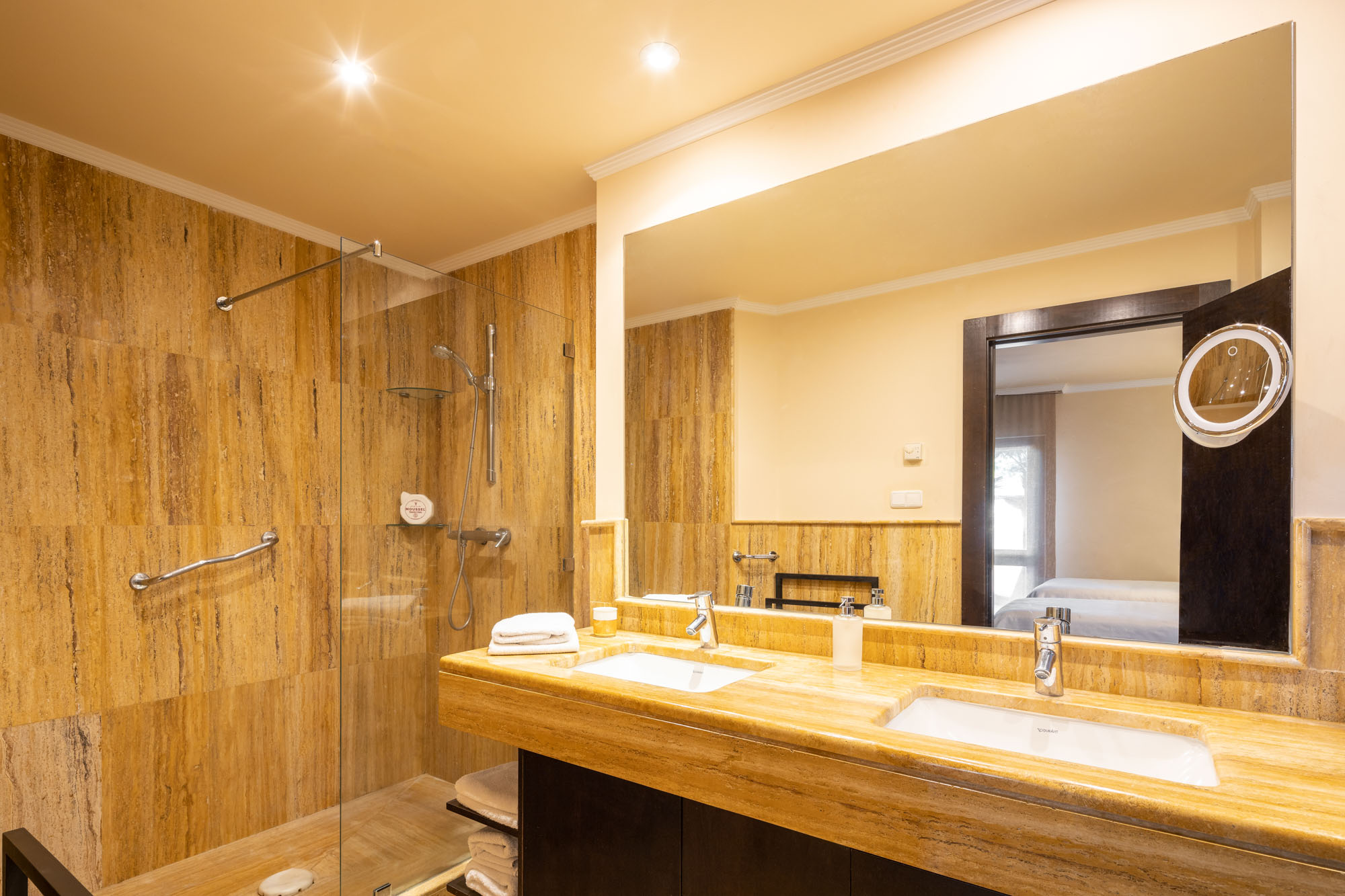 The en-suite bathroom is equipped with a walk-in shower, double wash basin, bidet and WC.