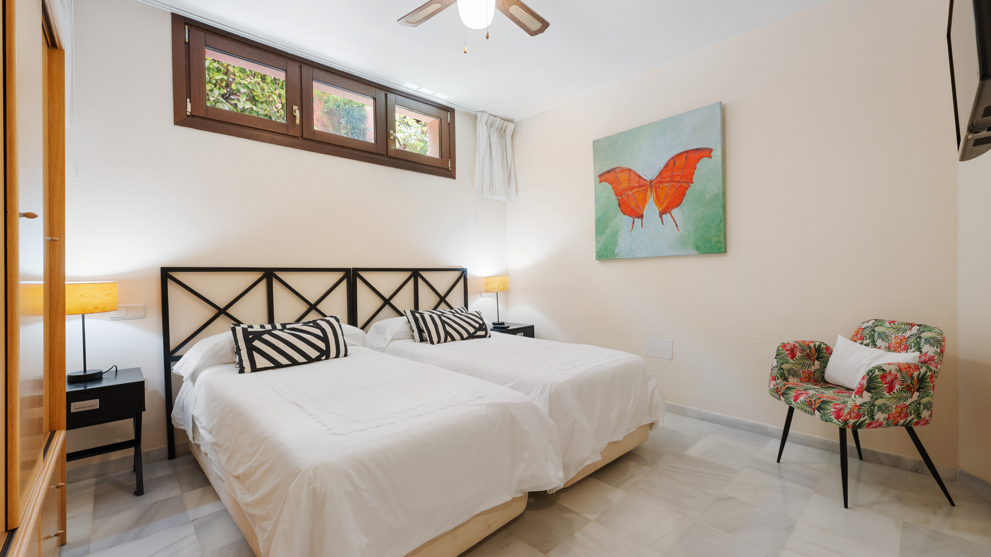 Guest Bedroom 3: Located on the ground floor and furnished with two single beds 90x190cm, smart TV, built-in wardrobe and drawers.