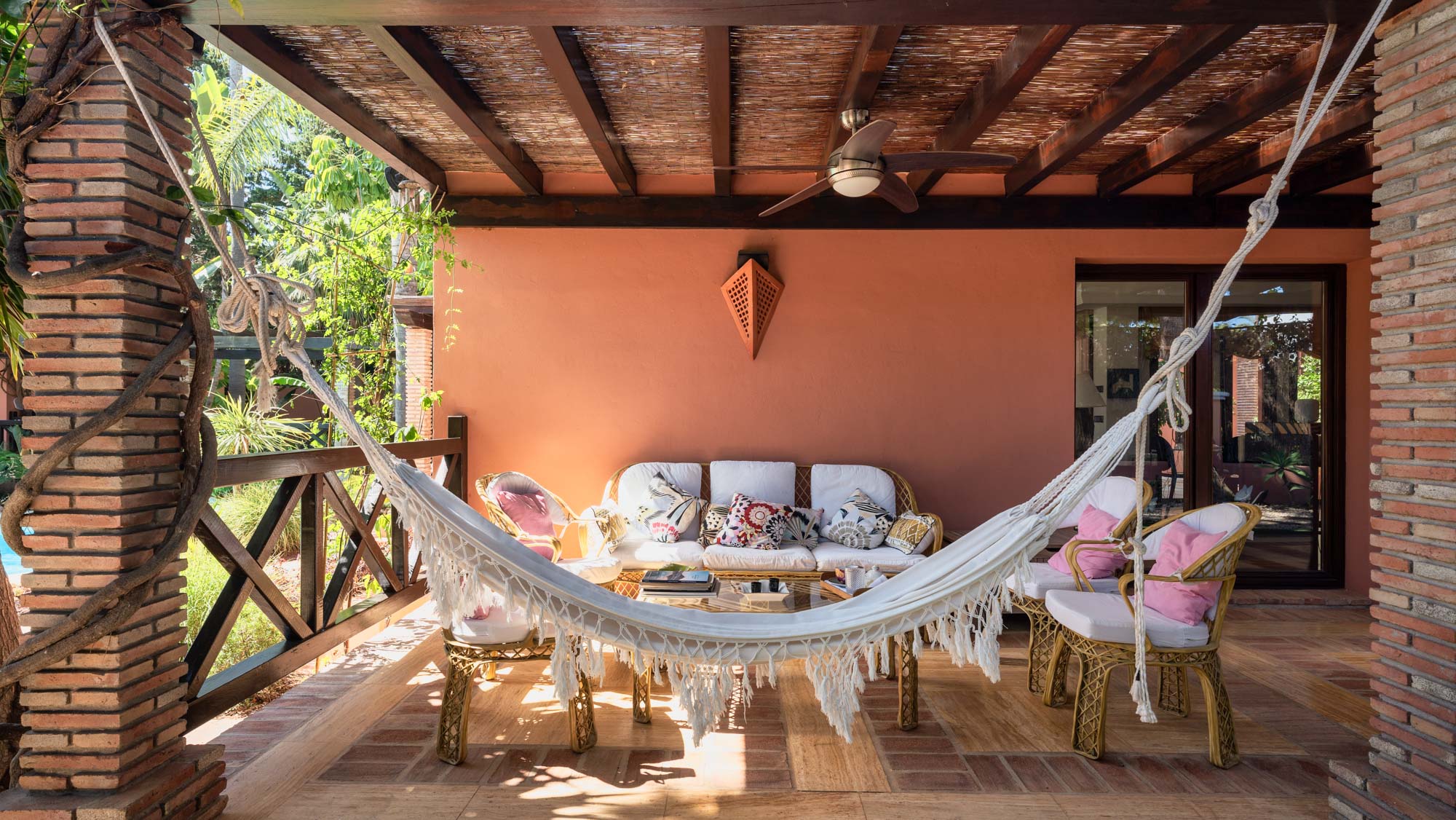 Two shady terraces are the perfect place to escape the heat. Both are furnished with comfortable wicker sofas and armchairs, and one features a hammock where you can enjoy a siesta lulled by the peaceful sounds of nature.