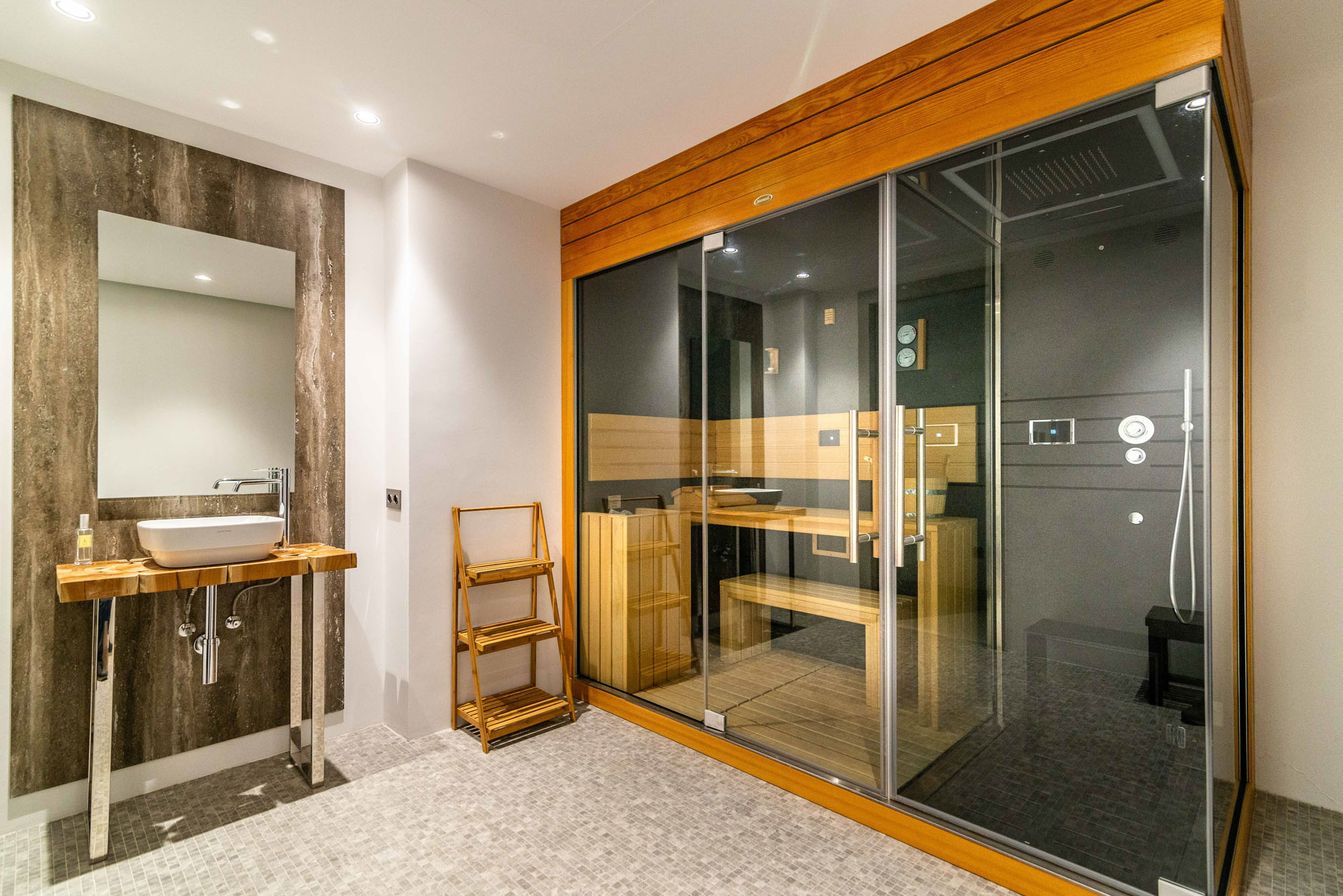 A separate bathroom is located across the hallway from bedroom five, fitted with a sauna, walk-in rain shower and wash basin.