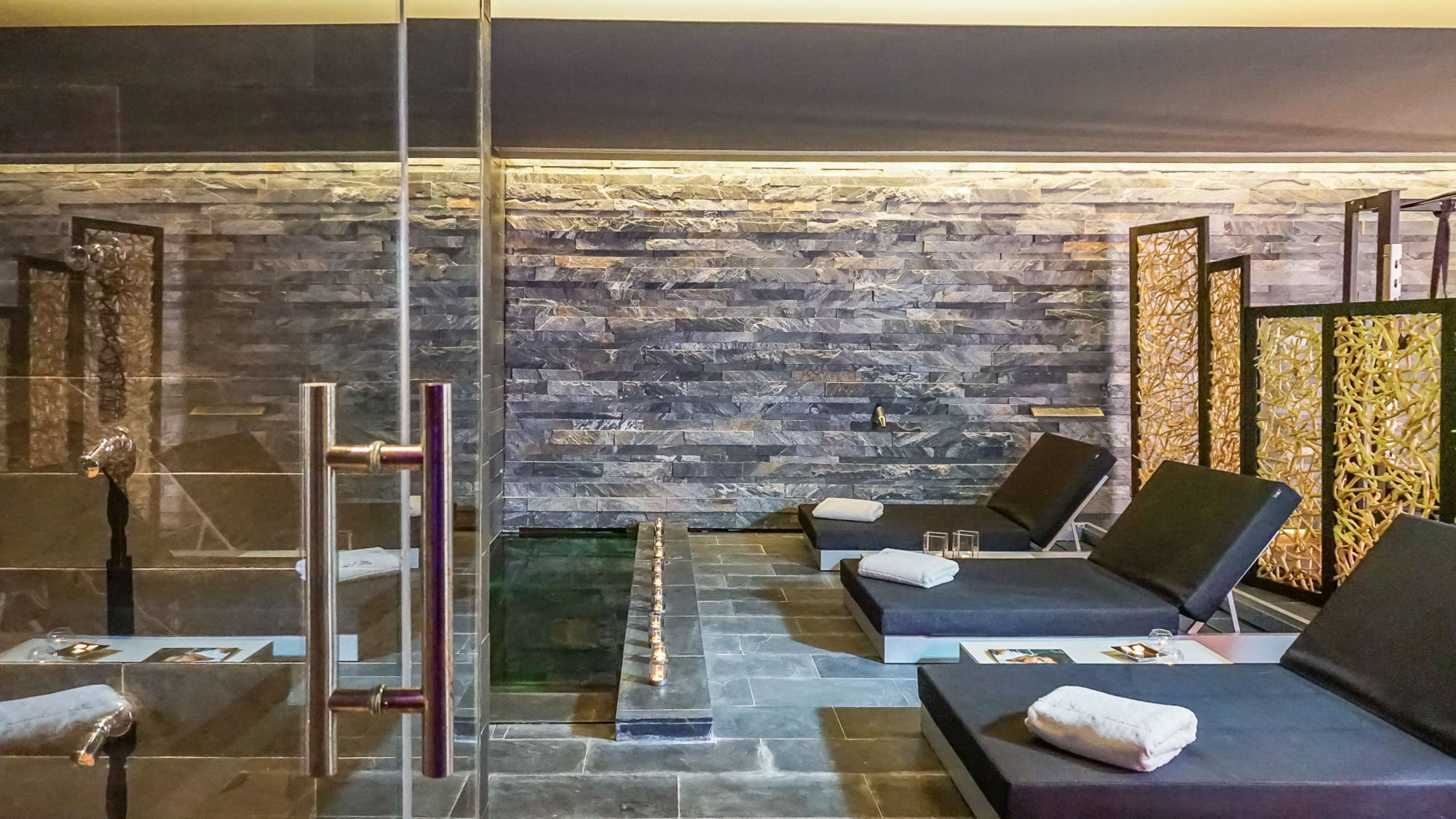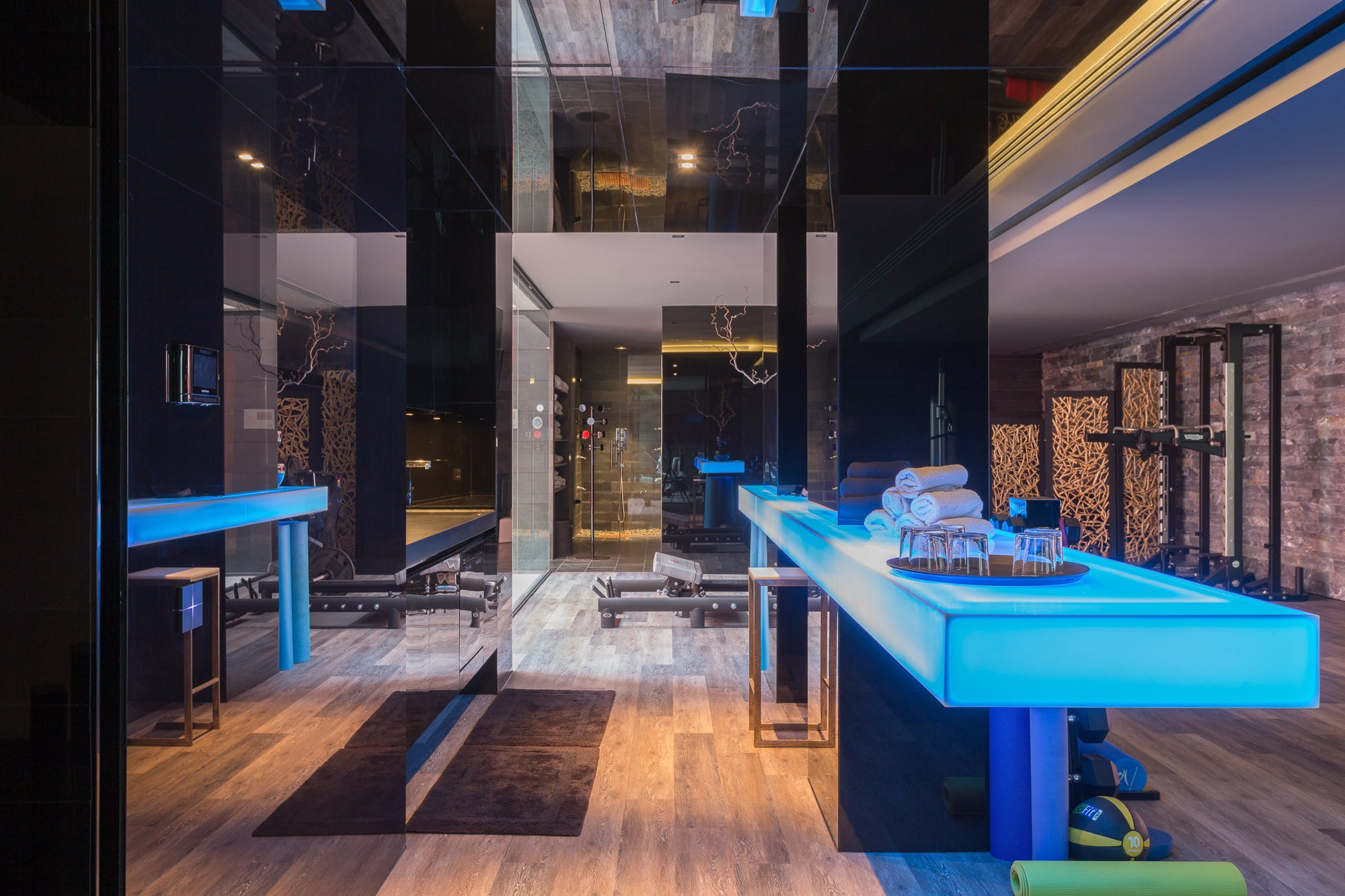 A health and fitness spa, decorated in soothing monochrome tones, occupies most of the ground floor and offers everything from a state-of-the-art TechnoGym, to a two-person hair salon, to massage and treatment rooms. There is also a multi-purpose yoga space, sauna and steam room, as well as an ice bath.