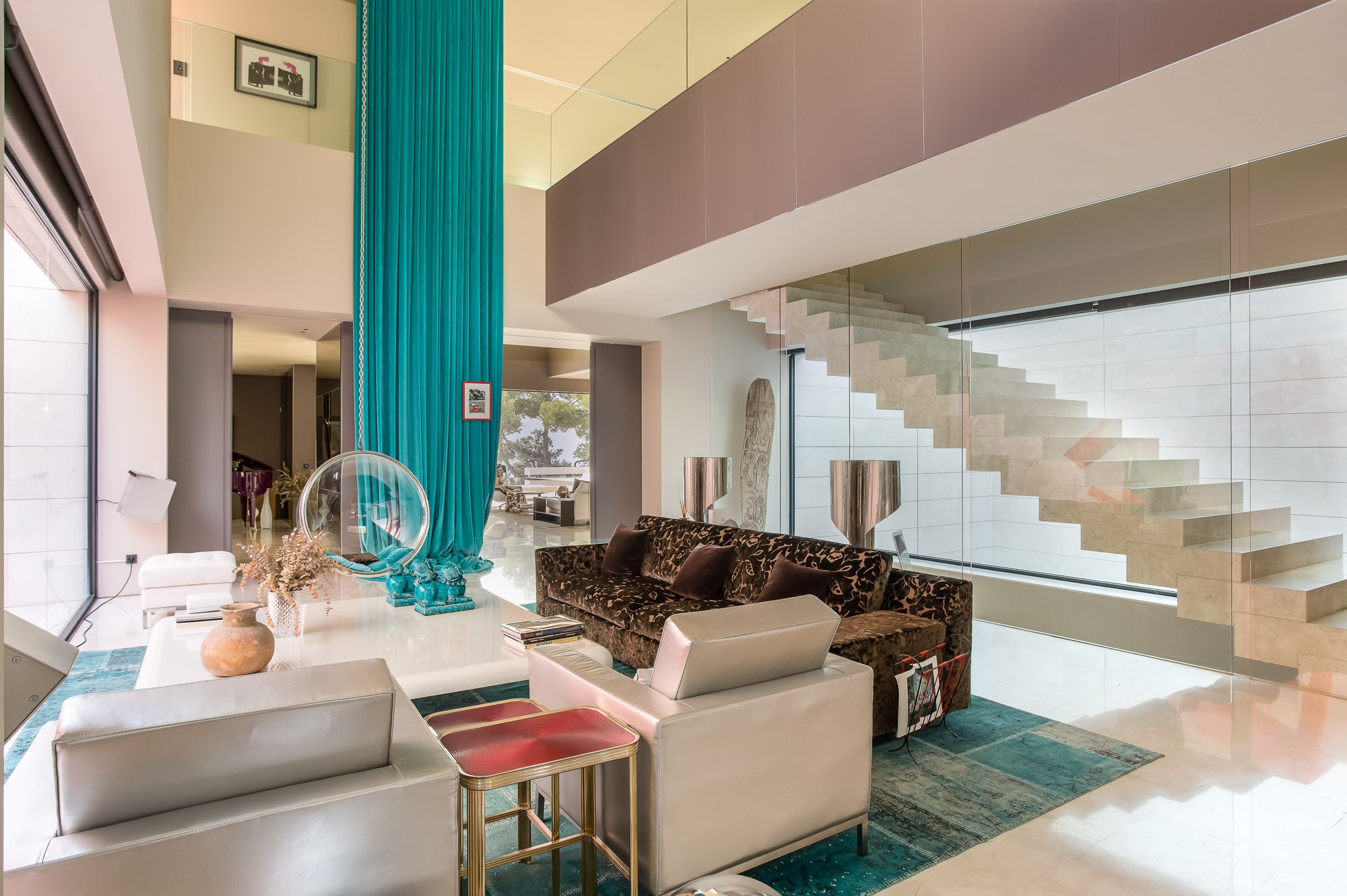 The first living space is designed for gazing at the bespoke red ribbon sculpture, twisting through a glass shaft passing through all 3 floors of the villa. The scale of the sculpture is matched by waterfall-like peacock blue drapes to one side, and the seamless floating staircase to the other.