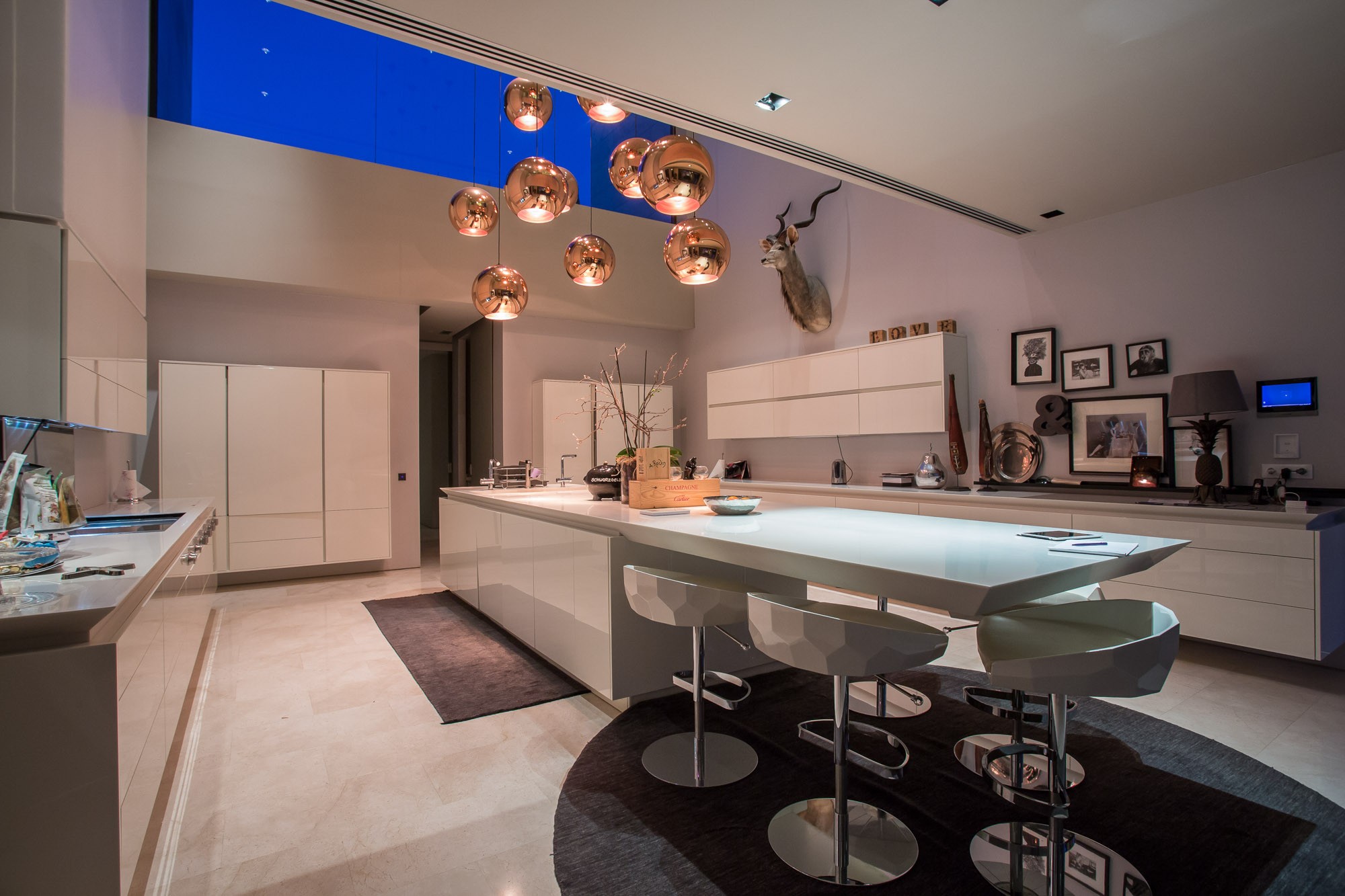 For informal meals, families enjoy sitting around the breakfast bar, where a TV emerges/lowers from sight.