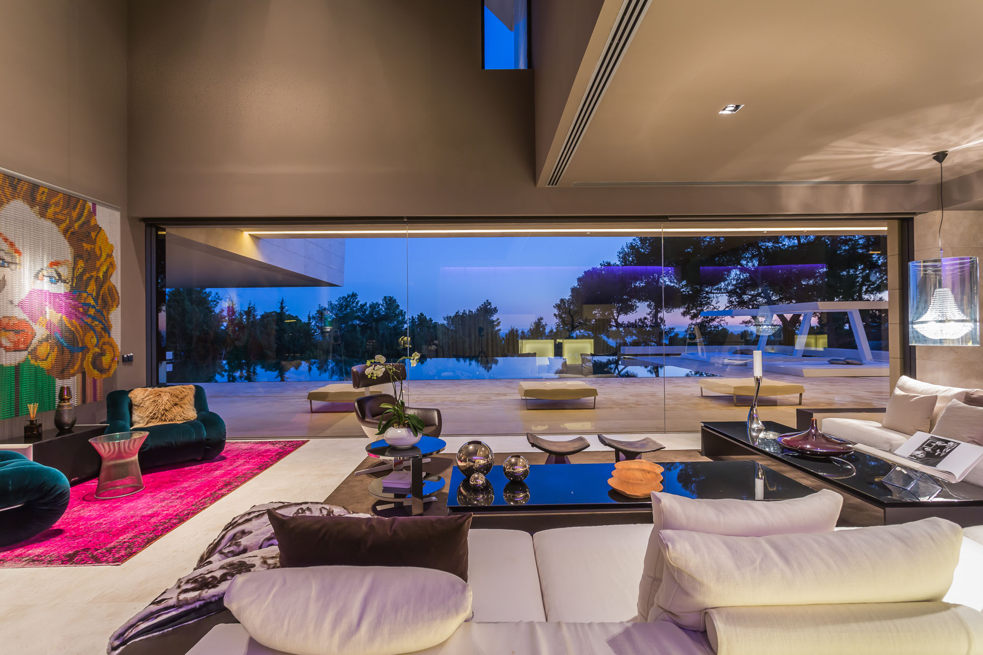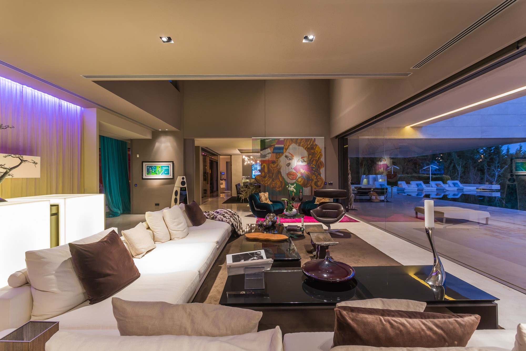 The stylish, monochrome main living room looks out onto the pool and gardens, and features chain-link modern artwork and a white cube that opens up to reveal a complete cocktail bar. Bright textiles and colour-changing LED lights add a pop of colour. Glass walls disappear into the floor for indoor-outdoor living, doubling the size of the space.
